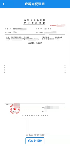 7.缴款成功后,系统提示是否需要打印缴费明细,点击【是】可查看带电子印章的完税证明,点击【保存到相册】可将完税证明下载保存。