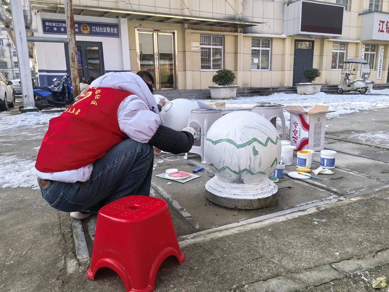 为深入落实《潜江市城市住宅小区“山墙文化”工作指引》,进一步提升小区人文环境品质,近日,广华寺街道江钻社区启动了服务大厅两侧石墩的彩绘美化工作。本次彩绘以“文明新风·绿色生活”为主题,涵盖文明养犬、垃圾分类、节约用水、保护环境等贴近居民生活的内容。色彩明快的图案与社区服务大厅的整洁环境相得益彰,既让原本单调的石墩成为传递文明理念的宣传载体,也为冬日的社区增添了一抹鲜活亮色。