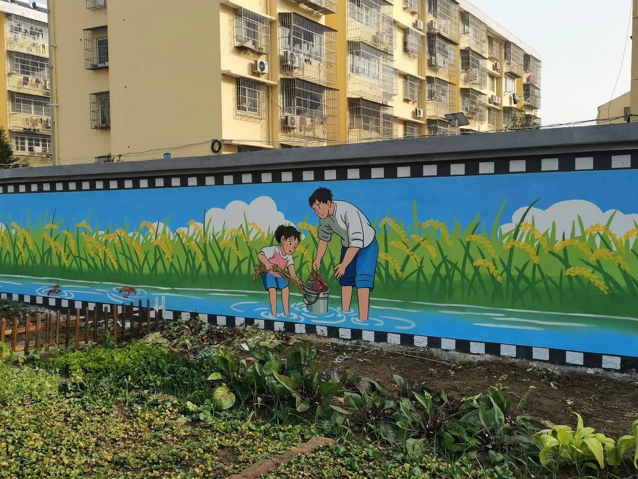 墙绘以一幅清晰的广华板块地图开篇,精准标注出广华寺街道及15个村、社区的地理方位,水杉公园、五七小龙虾等特色地标也跃然墙上,生动勾勒出本土地域印记。画面徐徐展开:瞧那金黄稻田中,虾稻共生的和谐图景栩栩如生;静静挺立的水杉,绿意摇曳,为社区增添一份宁静与生机;油田上运转的抽油机,勾勒出工业发展的壮丽轮廓;开心农场绿意盎然,亲子采摘的笑脸与藤蔓瓜果相映成趣,尽情体验农耕的乐趣与自然的馈赠;卡通天地则唤醒了纯真欢快的童趣时光。