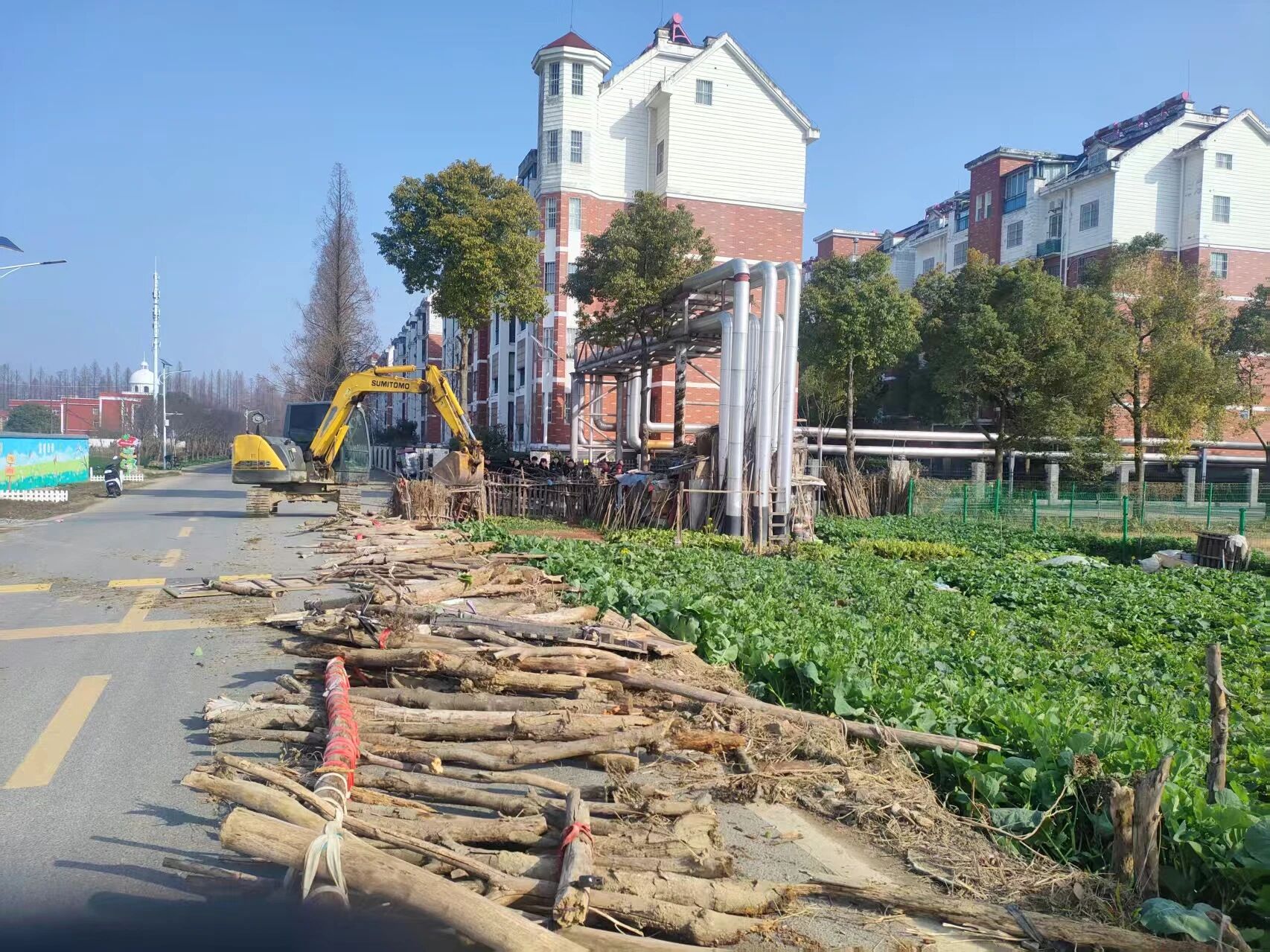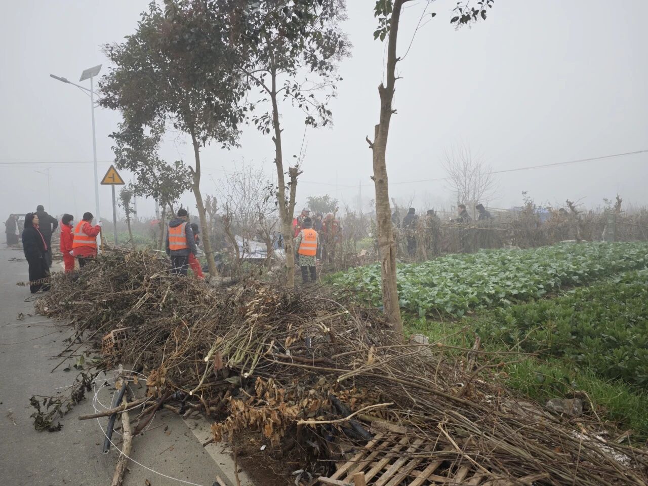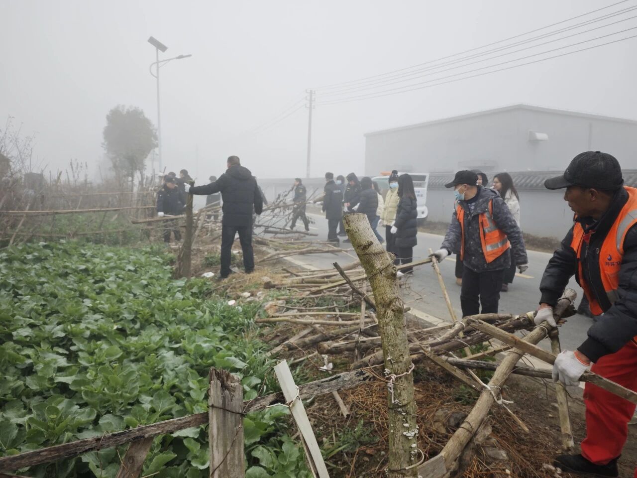 清晨的薄雾中,整治队伍迅速集结,按照“全面覆盖、不留死角”的原则,对同广沿线两侧的违规搭建栅栏、废弃杂物、私垦菜地等问题进行集中清理。现场,工作人员分工协作、协同发力,有的手持工具拆除违规木质、竹制栅栏,有的清理堆积的枯枝、废弃建材,还有的对道路旁的零散垃圾进行清扫清运。在机械助力下,2台挖机和农用拖车高效作业,将拆除的栅栏、杂物及时转运,确保整治现场干净有序。