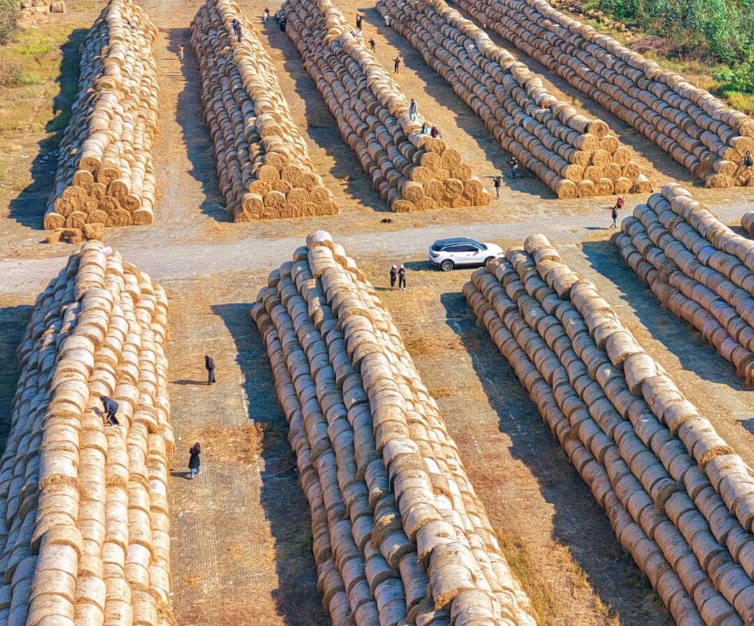 这一农旅新场景的诞生,源于管理区推动秸秆资源化利用的创新实践。通过构建“政府主导、企业运作、农户参与”的回收机制,后湖管理区组建专业队伍,免费为农户提供秸秆打捆、回收服务。目前,潜江市鑫金穗水稻种植专业合作社已完成后湖片区13000亩水稻秸秆收储,每亩回收约400公斤。这些秸秆被加工成饲料和蘑菇培养基料,销往北方地区,实现“变废为宝”。