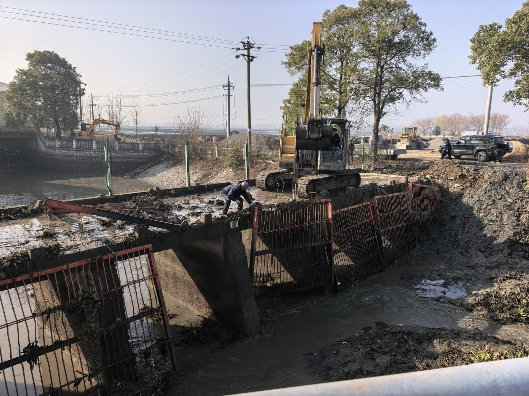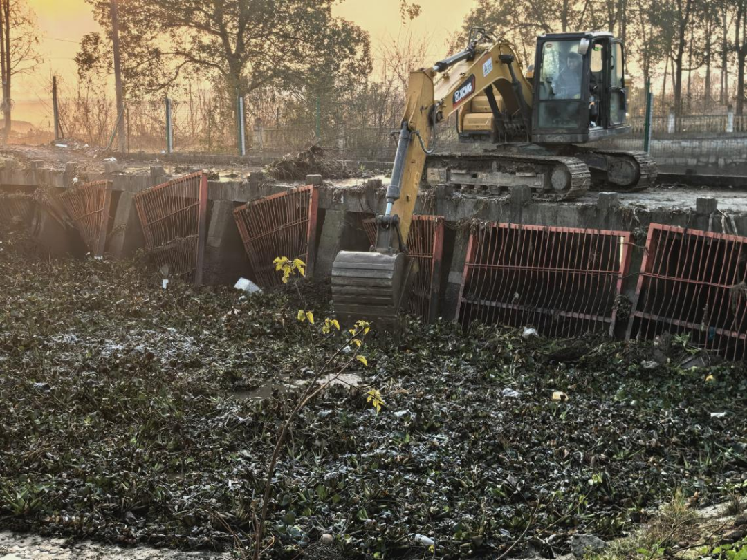 孙台泵站是办事处水利系统关键枢纽,承担周边近六千亩农田灌溉保障任务,其进水口防护围栏作为拦截水生植物和漂浮杂物的“过滤网”,直接关系泵站运行安全。此前围栏出现明显变形,若不及时处理将威胁灌溉保障。办事处党委高度重视,专题研究方案、争取上级资金,协调专业施工队在灌溉间歇期推进维修。施工人员先清理围栏周边淤泥、水生植物,再将变形围栏校正修复,并用角铁、钢筋全方位加固提升结构强度,高效完成维修任务。
