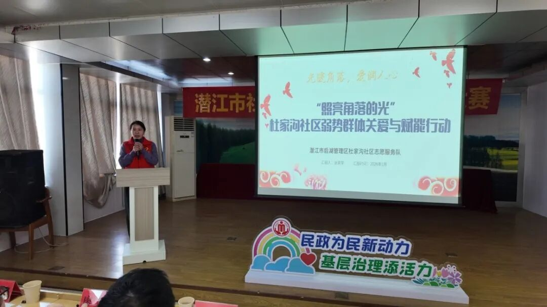 近日,由潜江市民政局主办的社区社会组织公益创投大赛圆满落幕。来自全市各社区的15个优质公益项目同台竞技,经过“项目路演+专家评审”的激烈角逐,后湖管理区杜家沟社区志愿服务队负责人张荣荣及其“照亮角落的光——弱势群体关爱与赋能项目”脱颖而出,荣获大赛三等奖,为基层社区公益事业注入新动力。