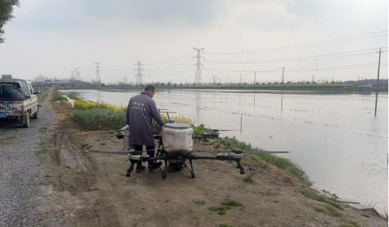 农户付克林站在虾田边的田埂上,手里操控着一台无人机。伴随着轻微的嗡鸣声,无人机腾空而起,掠过波光粼粼的水面,均匀地撒下虾田专用肥料。细密的颗粒如春雨般洒落,在水面激起圈圈涟漪。过去这个时候,给上百亩虾田撒肥,得划着小船一瓢一瓢地抛洒,或者背着沉重的肥料桶沿着田埂边走边撒,一整天下来腰都直不起来;如今,站在田埂上动动手指,几十亩虾田的肥料播撒,个把小时就能完成。