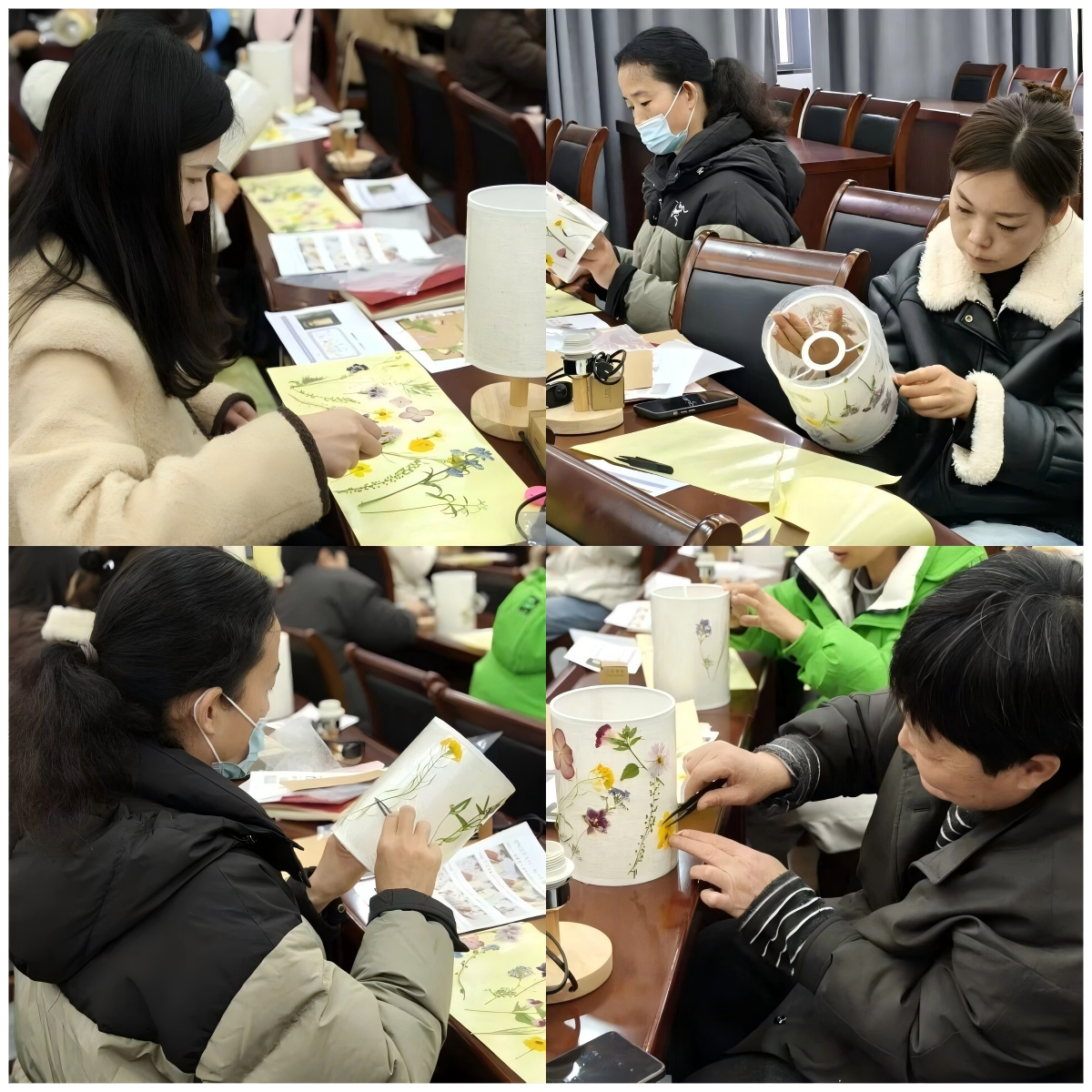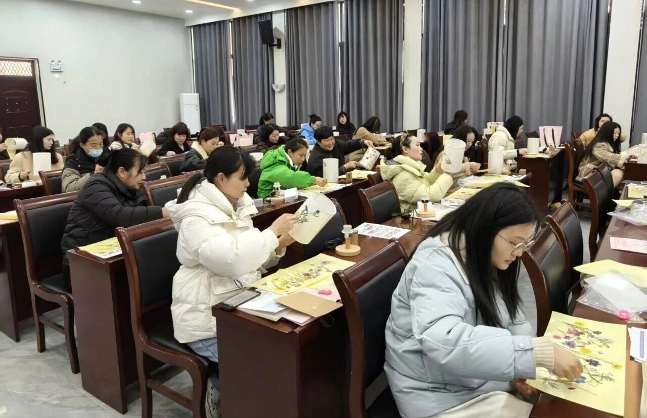 在老师的指导下,大家兴致勃勃地投入创作。挑选花材、构思图案、修剪枝叶、粘贴固定……每一步都专注而细致。现场气氛轻松热烈,不时传来交流声与欢笑声。经过一个多小时的精心制作,一盏盏充满自然气息与个人巧思的台灯陆续亮起,柔和的灯光透过花瓣叶脉,映照出温馨的光影,也映衬出女同胞们喜悦的面容。