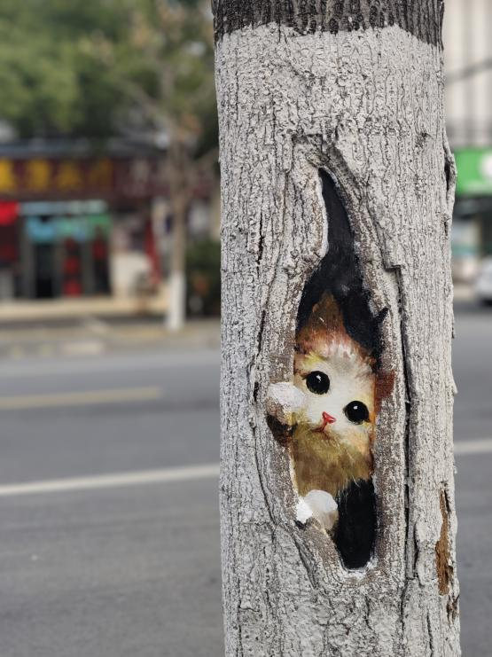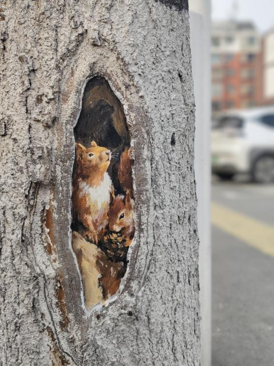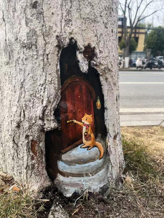“快看,树上藏着小兔子!”近日,潜江市南浦路、东风路等路段的行道树成了市民打卡的“新地标”——原本因自然损耗或人为因素形成的树洞,经画师巧手描绘,变身憨态可掬的小动物、充满童趣的卡通形象,这些别致的“萌系创可贴”不仅为冬日街头增添了亮丽色彩,更以艺术温度治愈着城市“伤口”,让市民在步履匆匆中收获意外的温馨与浪漫。