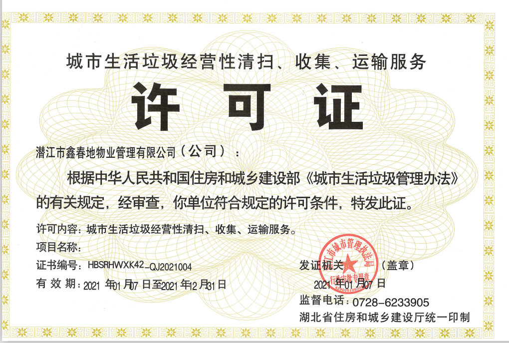 名 称: 城市生活垃圾经营性清扫、收集、运输服务许可证(鑫春地物业管理有限公司)