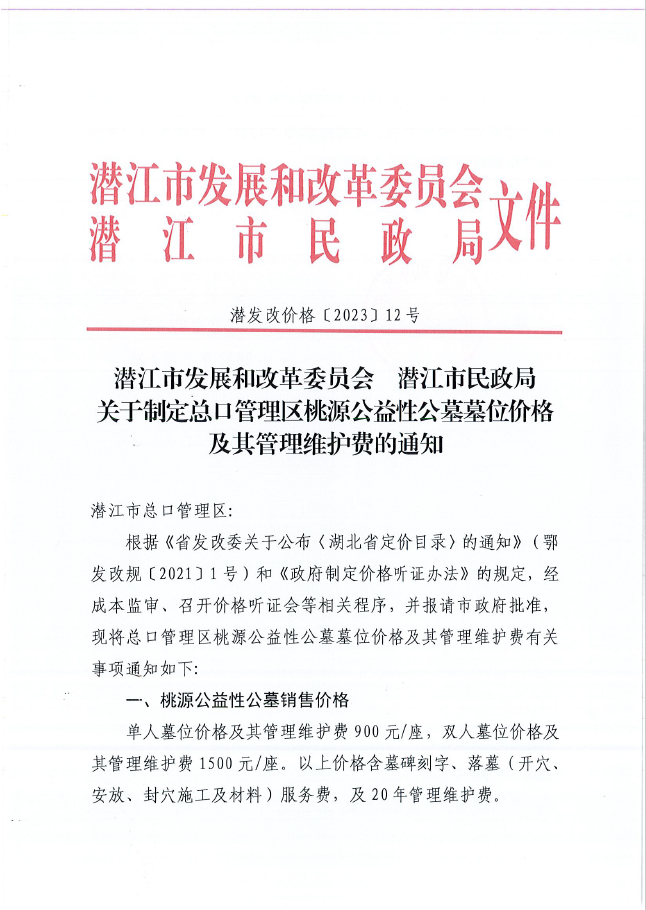 关于制定总口管理区桃源公益性公墓墓位价格及其管理维护费的通知