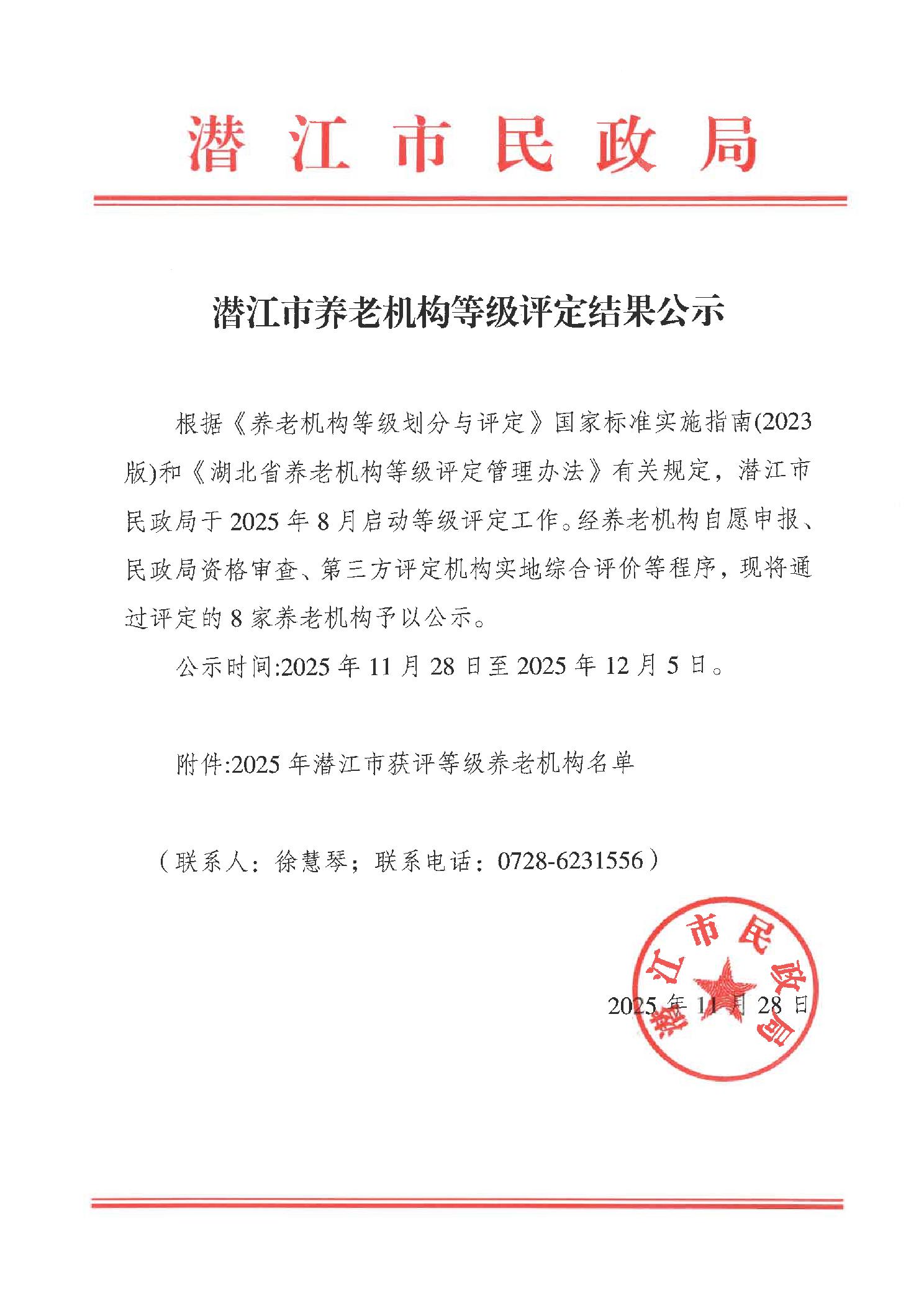 潜江市养老机构等级评定结果公示