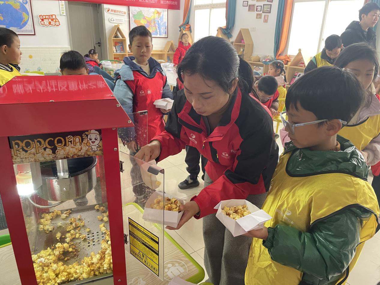 最令人期待的炸爆米花环节将活动氛围推向顶峰。随着锅里的玉米粒在高温下逐渐爆开,“噼啪”声此起彼伏,香甜的气息瞬间弥漫开来。孩子们目不转睛地盯着锅具,不时发出阵阵惊喜欢呼。捧着热乎乎、甜滋滋的爆米花,孩子们你一口我一口分享着,甜蜜的滋味在舌尖蔓延,幸福的笑容在脸上绽放。