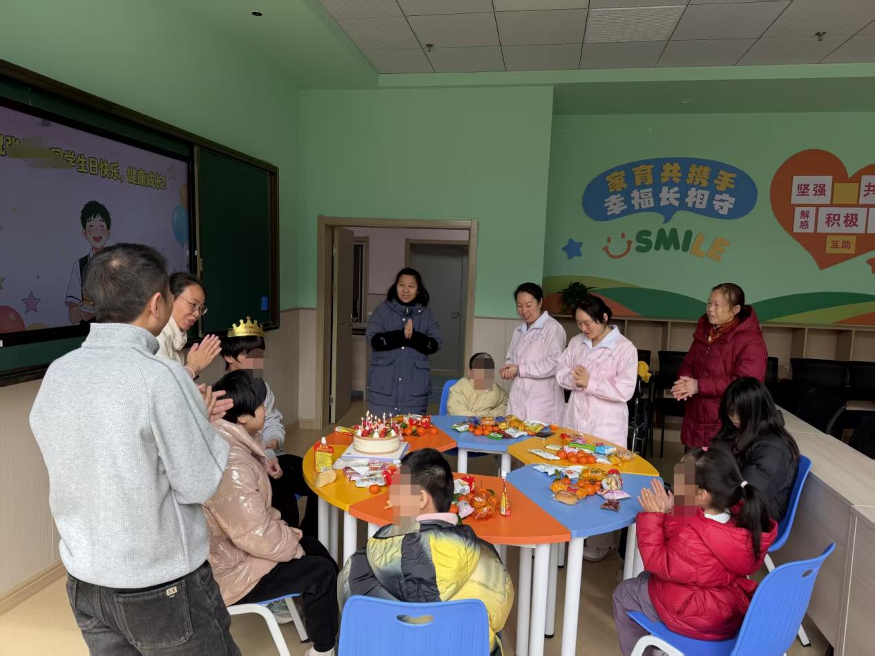 生日会在全体工作人员的祝福声中拉开序幕。烛光点亮的瞬间,活动室里安静下来,小辉闭上眼睛,默默许下新学期的美好心愿。在大家齐声唱响的生日歌里,他吹灭蜡烛,脸上洋溢着幸福的笑容。