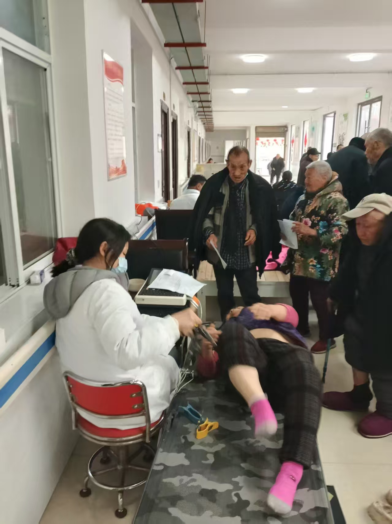 义诊现场,工作人员引导协助院民有序排队,依次就诊。卫生院的医护团队耐心细致地为院民开展多项健康检查,涵盖血常规检测、血压测量、身高体重测量、心电图检查、B超检查等常规及专项体检项目,针对有问诊需求但行动不便的卧床老人,福利院工作人员陪同医护人员一一上门问诊,并给出专业诊疗建议和用药指导。