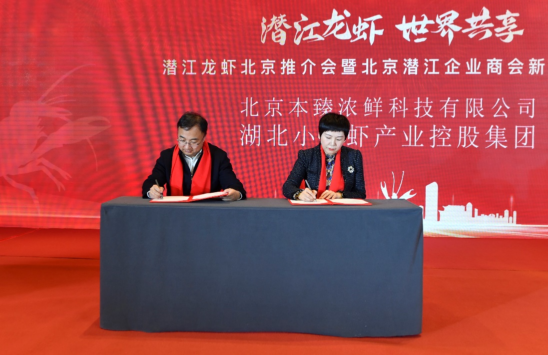 会上,潜江华山科技股份有限公司、湖北小龙虾产业控股集团、湖北新柳伍食品集团有限公司、湖北楚虾王食品科技有限公司、潜江湖耕食品有限公司、潜江虾皇食品有限公司、潜江晓飞歌调味品有限公司等7家企业分别与北京相关企业进行合作签约。
