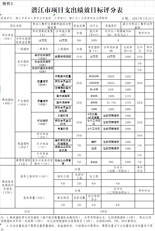 根据预算绩效管理要求,本部门组织对2024年度一般公共预算项目支出全面开展绩效自评,共涉及项目1个,资金18万元,占一般公共预算项目支出总额的100%。从评价情况来看,“劳动人事争议调解仲裁综合经费”已完成预算绩效目标,保障了我市劳动人事争议仲裁工作的正常运转。