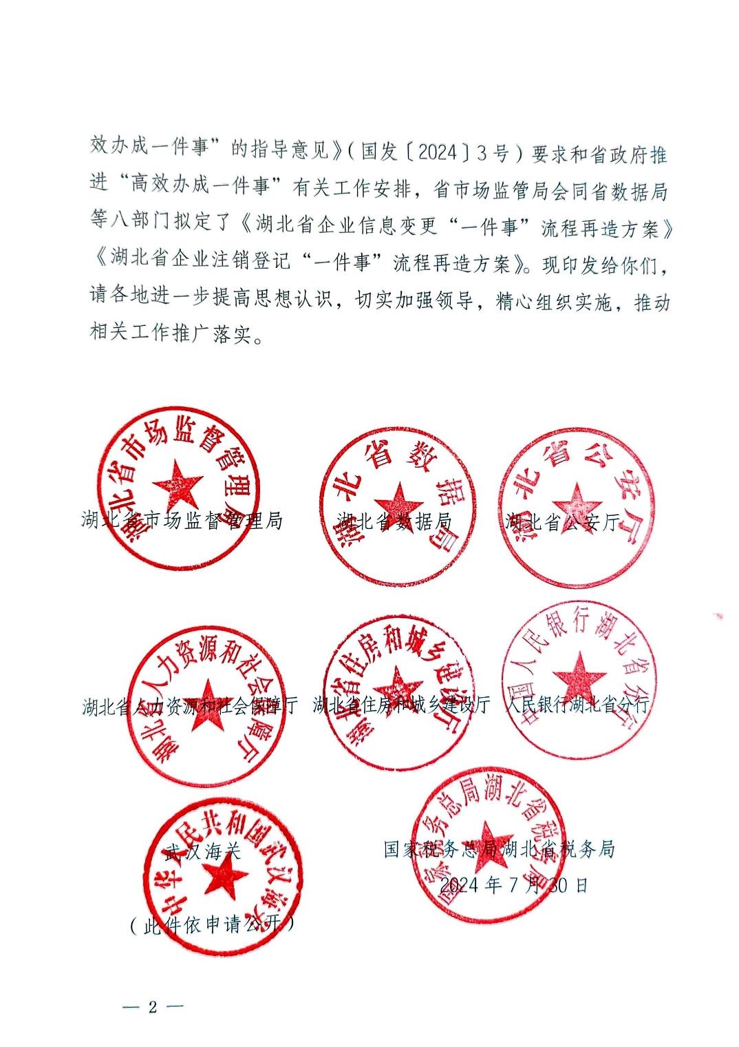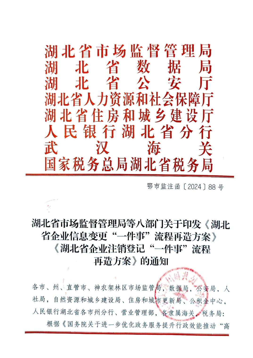 湖北省市场监督管理局等八部门关于印发《湖北省企业信息变更“一件事”流程再造方案》《湖北省企业注销登记“一件事”流程再造方案》的通知