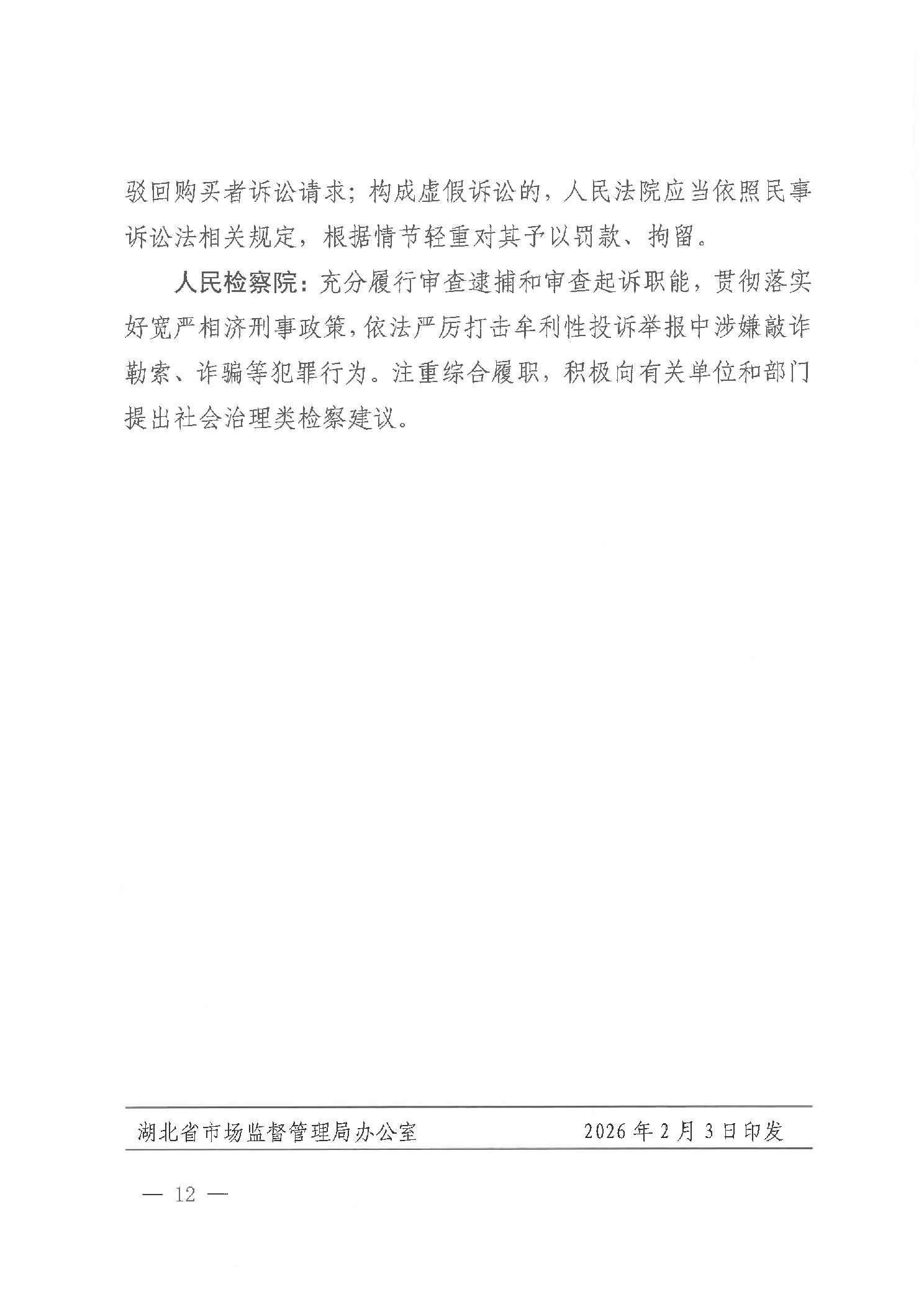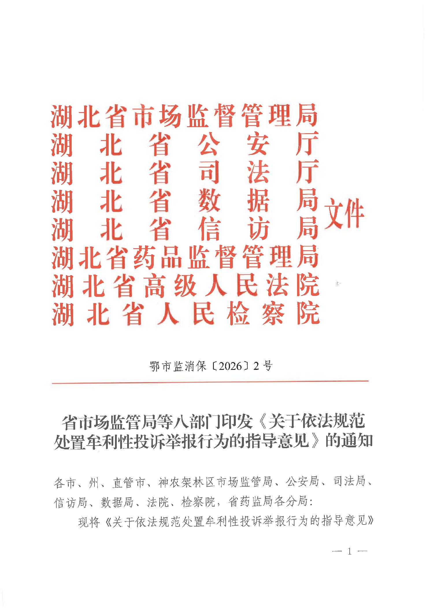 索 引 号: 011396186/2026-05470 主题分类: 其他 发布机构: 省市场监管局等八部门 发文日期: 2026年02月05日 15:40:00 文  号:鄂市监消保[2026]2号 效力状态: 有效 发布日期: 2026年02月05日 15:40:00 名  称: 省市场监管局等八部门印发《关于依法规范处置牟利性投诉举报行为的指导意见》的通知