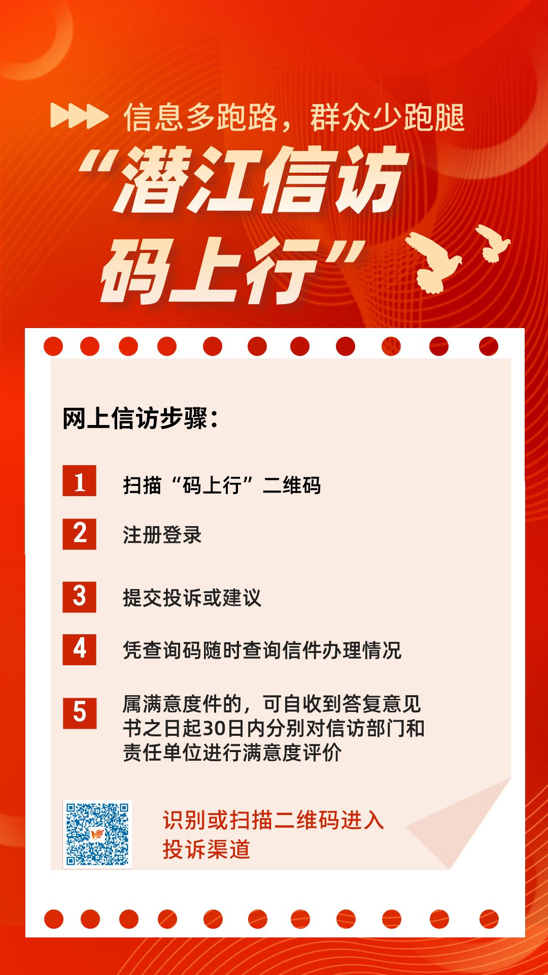 为进一步优化网上信访渠道,提升网上信访整体效能,潜江市大力推行网上信访“码上行”,实行网上实名投诉。目前,潜江信访“码上行”二维码已基本覆盖全市所有区、镇、街道群众接待场所,村(社区)党员群众服务中心。