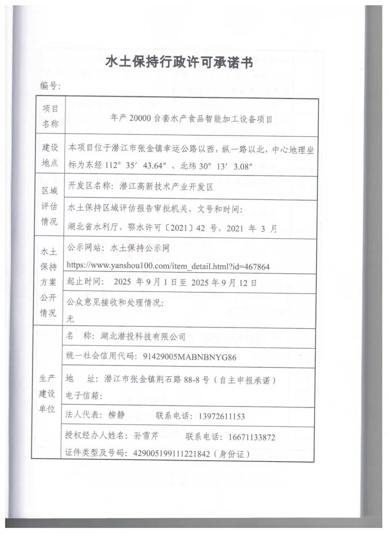 名 称: 湖北潜投科技有限公司年产 20000台套水产食品智能加工设备项目