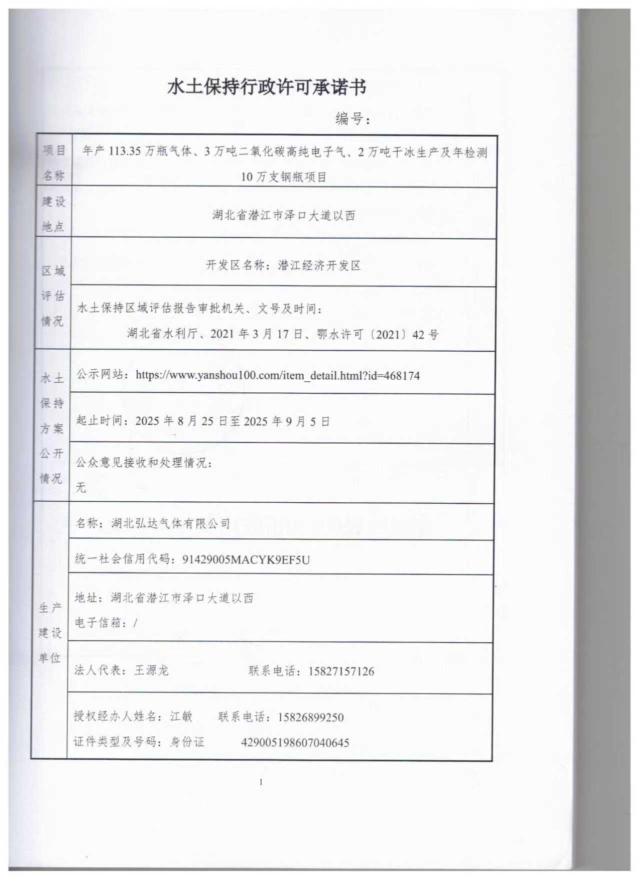 湖北弘达气体有限公司年产 113.35 万瓶气体、3 万吨二氧化碳高纯电子气、2万吨干冰生产及年检测 10万支钢瓶项目水土保持方案许可