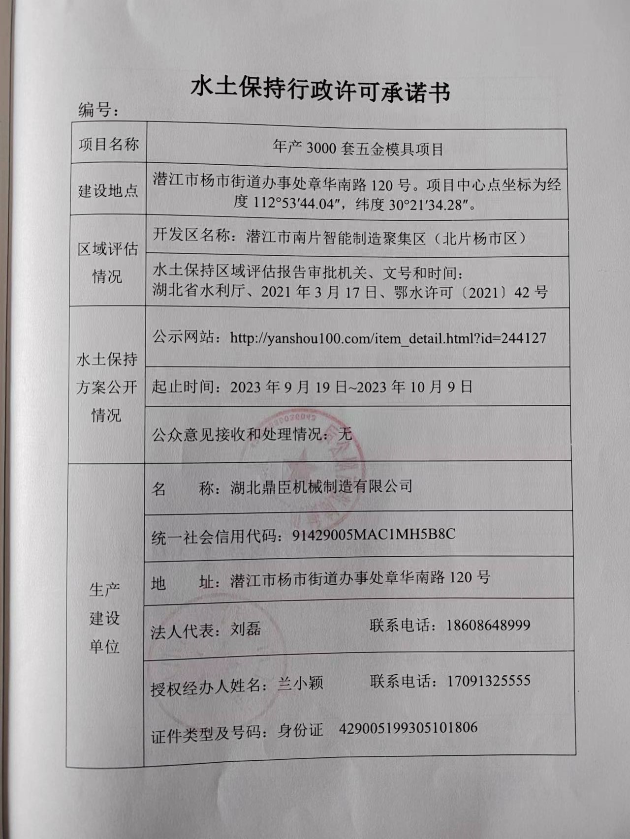 名 称: 湖北鼎臣机械制造有限公司工程建设水土保持方案批复