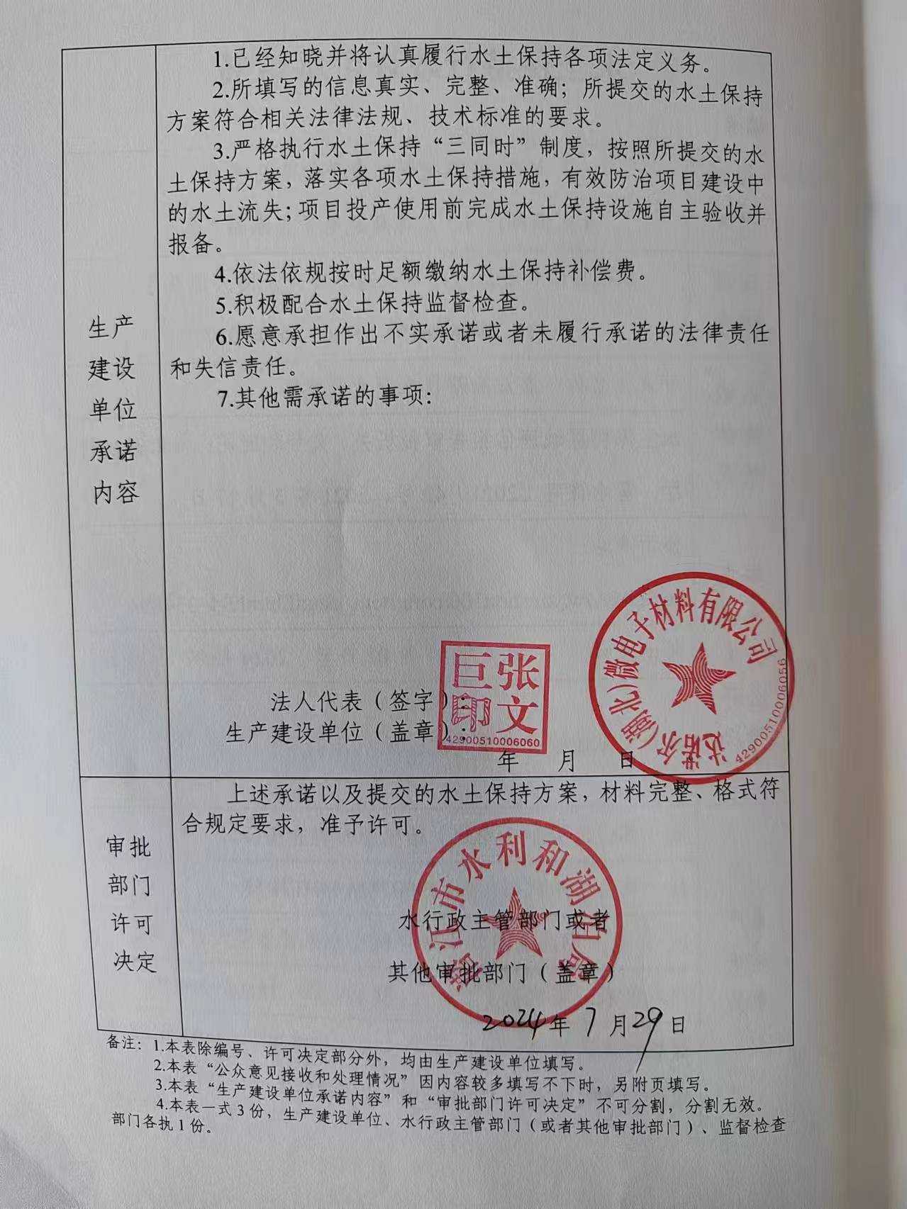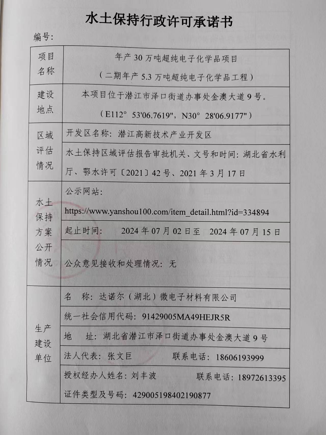 名 称: 达诺尔(湖北)微电子材料有限公司年产30万吨超纯电子化学品项目水土保持方案的批复