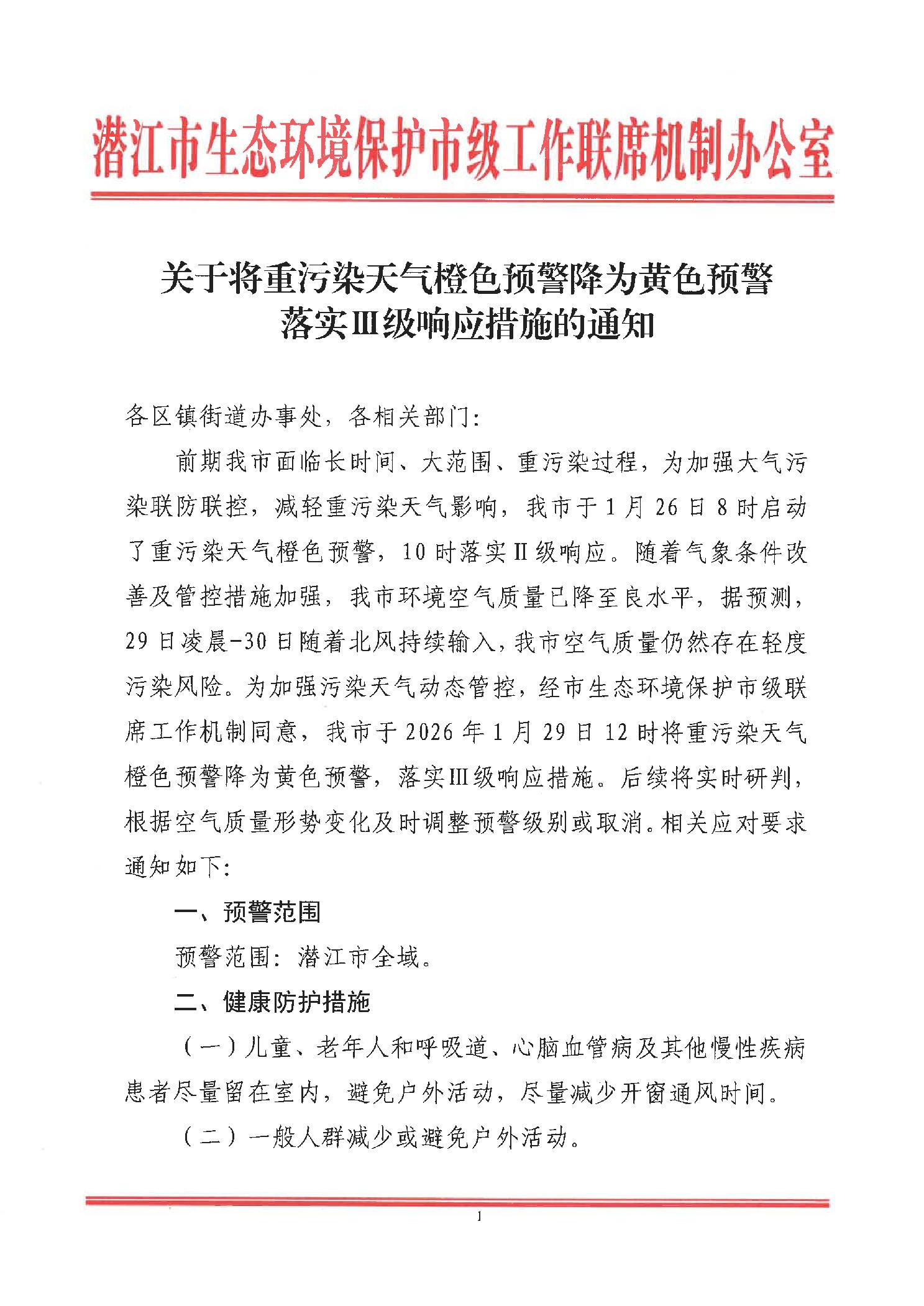 关于将重污染天气橙色预警降为黄色预警落实Ⅲ级响应措施的通知