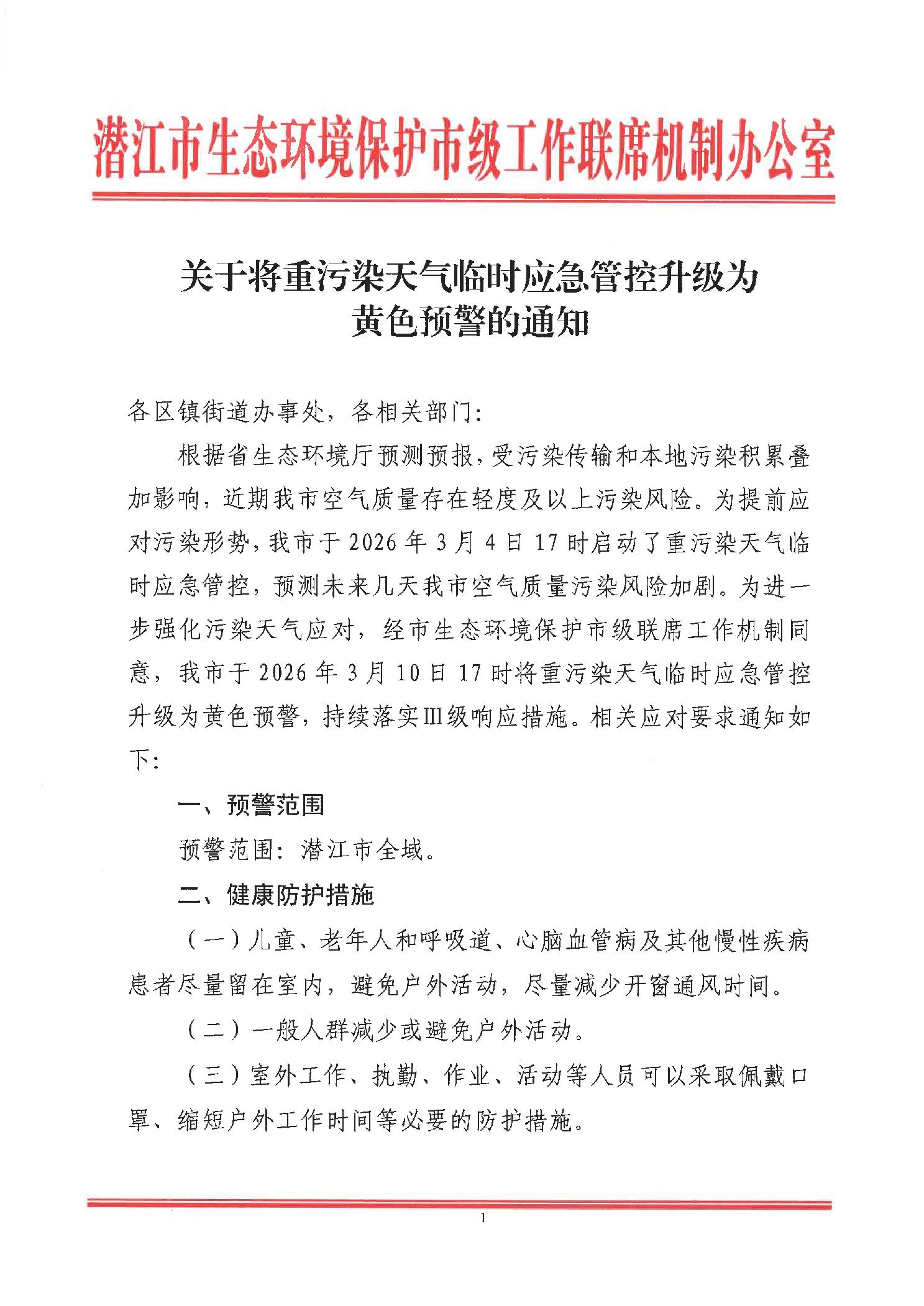 关于将重污染天气临时应急管控升级为黄色预警的通知