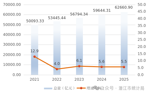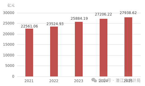 初步核算,2025年全省生产总值为62660.90亿元,按可比价格计算,比上年增长5.5%。其中,第一产业增加值5380.66亿元,增长3.5%;第二产业增加值21865.90亿元,增长5.1%;第三产业增加值35414.34亿元,增长6.0%。三次产业结构由2024年的9.1:35.7:55.2调整为8.6:34.9:56.5。人均地区生产总值为107619元,按可比价格计算,比上年增长5.7%。