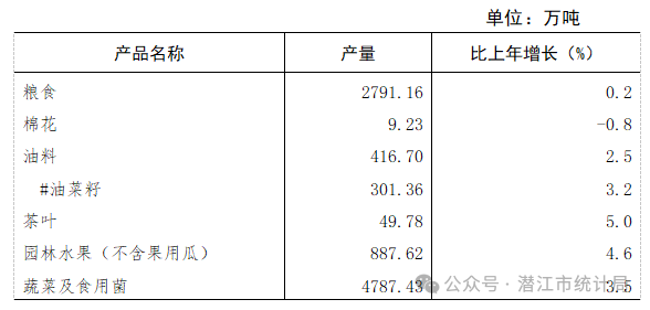 全年油料产量416.70万吨,比上年增长2.5%;茶叶产量49.78万吨,增长5.0%;园林水果产量887.62万吨,增长4.6%;蔬菜及食用菌产量4787.43万吨,增长3.5%。