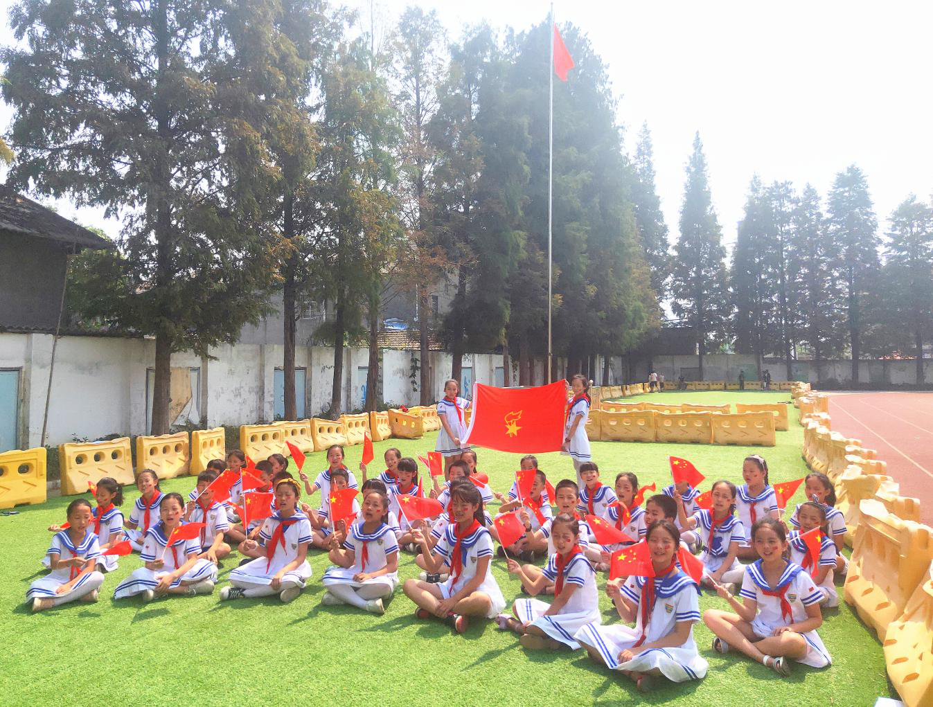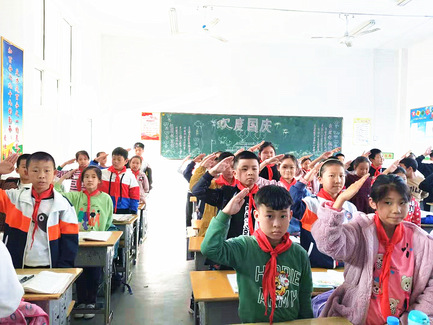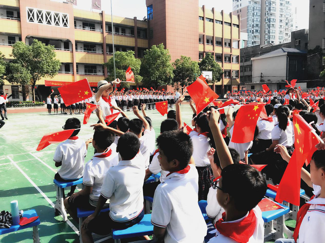 潜江市周矶逸夫小学开展了《致敬红领巾!》、“我与国旗合个影”、“我为新中国唱首歌”等系列活动,全体少先队员通过合唱《我和我的祖国》、与国旗合影、为祖国点赞等方式,传承红色基因,努力做新时代好队员。