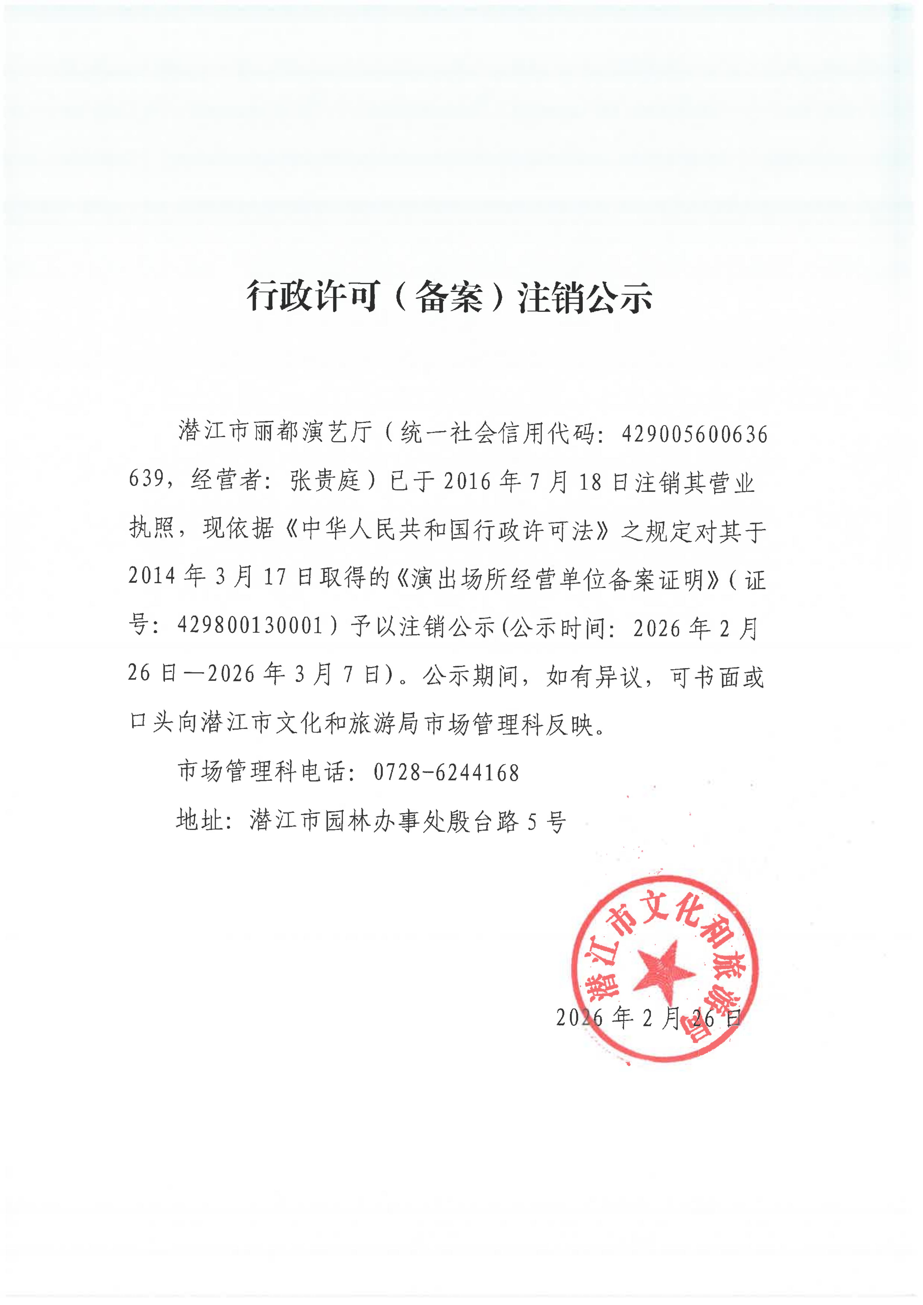 行政许可(备案)注销公示