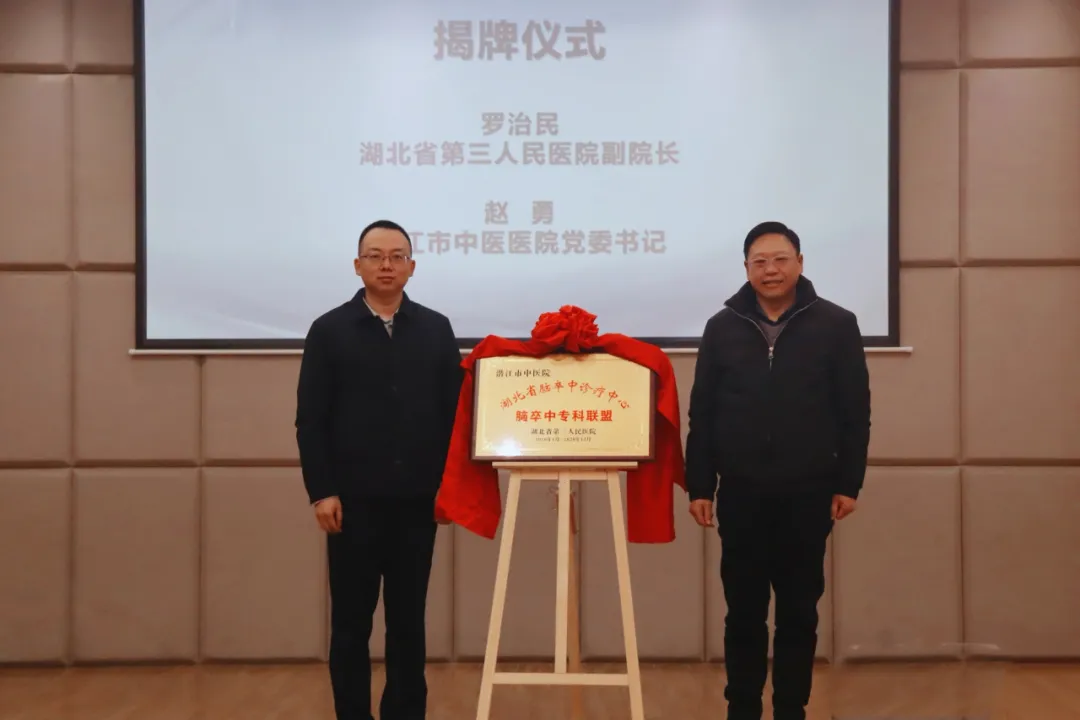 随后,罗治民与潜江市中医院党委书记赵勇共同为“湖北省脑卒中诊疗中心专科联盟成员单位”揭牌,红色幕布缓缓揭开,现场掌声雷动,标志着潜江卒中防治工作正式迈入“省级赋能、中西医协同”的全新发展阶段。