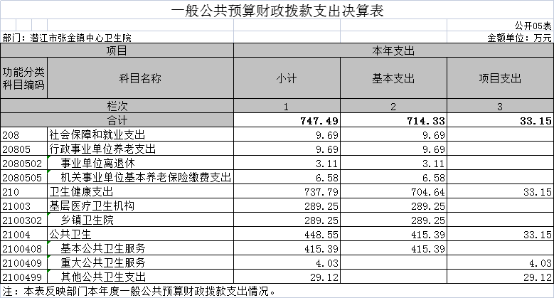 本单位一般公共预算财政拨款支出747.49万元,与上年相比,支出增加191.10万元,增长34.35%。按“类、款、项”分:卫生健康支出-基层医疗卫生支出-乡镇卫生院289.25万元;卫生健康支出-公共卫生支出448.55万元,卫生健康支出-事业单位养老支出9.69万元。