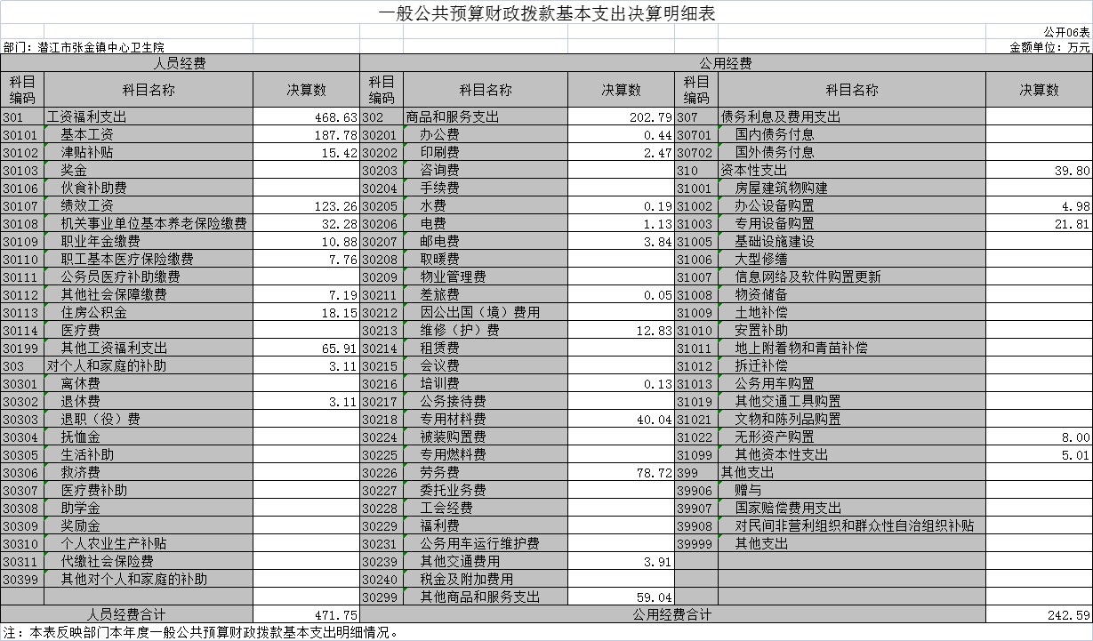 潜江市张金镇中心卫生院年度财政拨款基本支出468.56万元,其中: