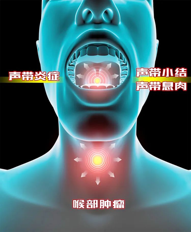 声带小结、声带息肉(指发生于声带的息肉样组织)也是引起声嘶的常见原因之一,它会对声带的振动发声产生影响,多为发声不当或过度发声所致,也可继发于上呼吸道感染。喉部肿瘤是易被忽视,也是最值得重视的声嘶诱因之一。长期烟酒过度、生活环境中空气污染严重、喉部的病毒感染、慢性声带炎症刺激等,均可导致喉部肿瘤,如喉癌。喉癌早期通常没有其他典型症状,大部分患者仅在早期出现声音轻度嘶哑,后期逐渐加重,最后甚至会完全失声;还时常伴有咳嗽、咳痰、痰中带血丝,晚期出现呼吸困难。很多喉癌患者就是早期声音嘶哑不重视,直到出现呼吸困难才去医院看病,错过了最佳治疗时机。