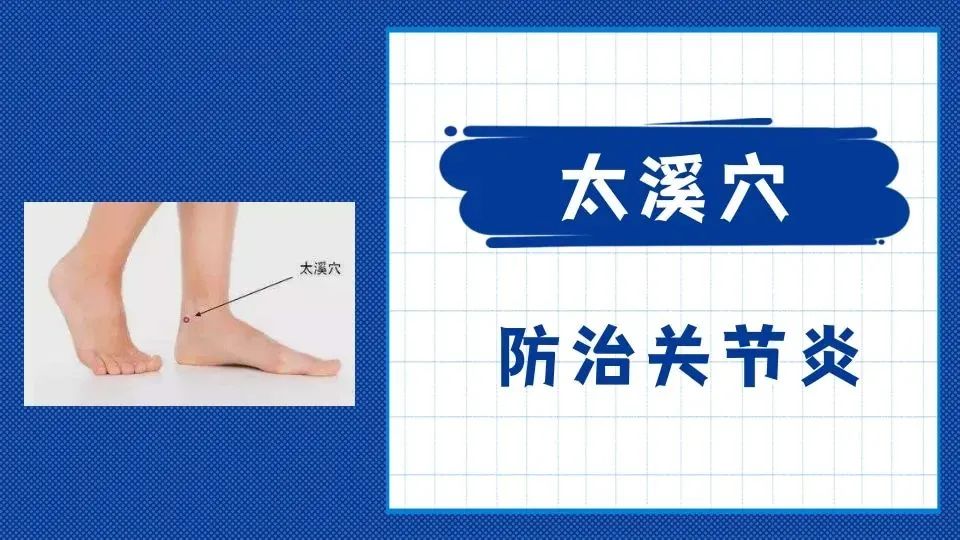 ②太溪穴:其位于足内侧,内踝后方与脚跟骨筋腱之间的凹陷处,也就是说在脚的内踝与跟腱之间的凹陷处。常用于防治牙痛、喉咙肿痛、气喘、支气管炎、手脚冰凉、关节炎、风湿痛等。