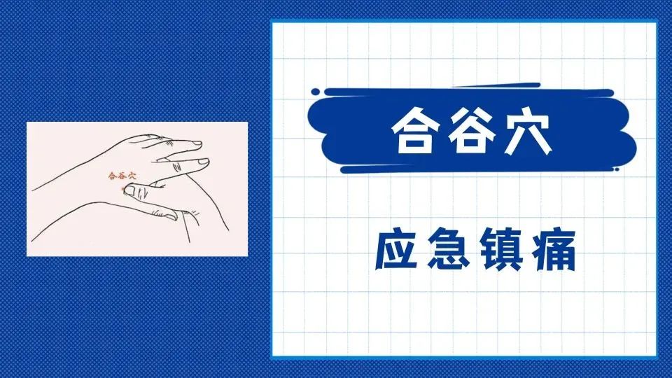 ④合谷穴:在手背,第1、2掌骨间,当第二掌骨桡侧的中点处。各种痛症都可以用来应急镇痛,此外晕车、恶心等症状也可应急运用。