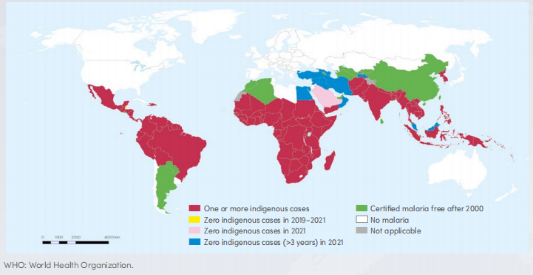 (注:红色地区:报告1例及以上本土病例;黄色地区:2019-2021年本土病例零报告;粉色地区:2021年本土病例零报告;蓝色地区:2021年本土病例零报告,且持续3年以上;绿色地区:2000年后认证无疟疾;白色地区:非疟疾流行区)