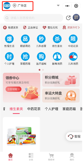 第一步:打开微信,搜索并进入“福元堂医药连锁微商城”小程序,选择门店“广华店”。