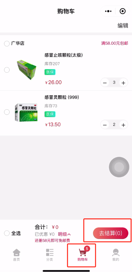第二步:选择药品,添加进“购物车”后点击“去结算”。