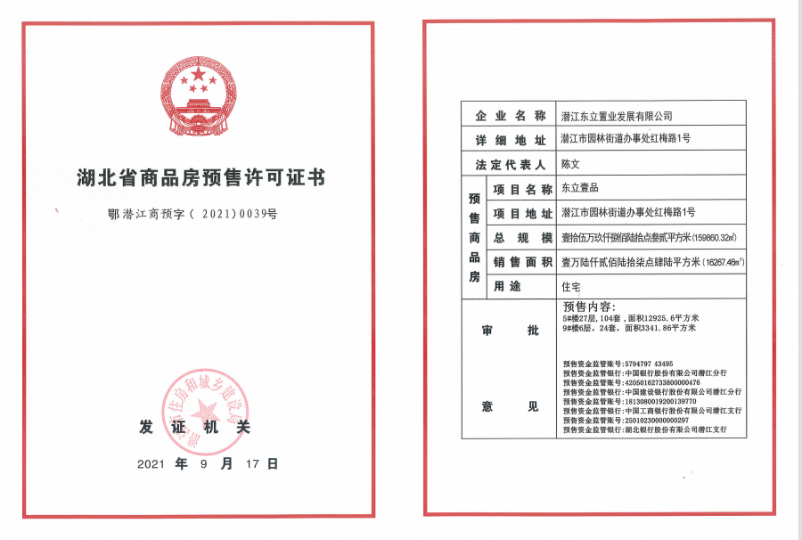 东立壹品5号、9号楼商品房预售许可证