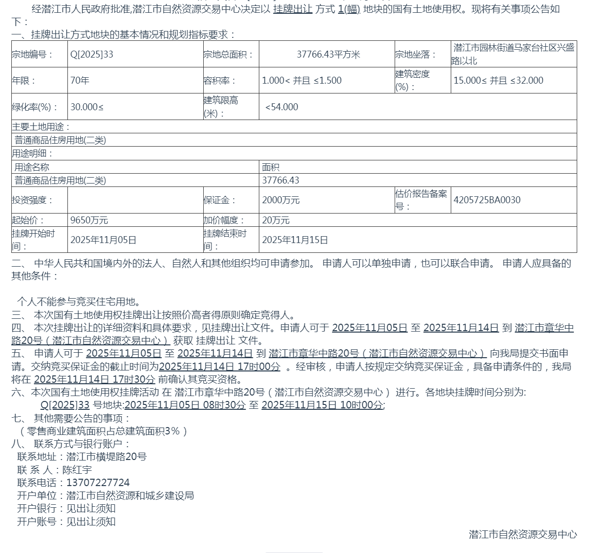 潜江市国有土地使用权挂牌出让公告(潜土交告字[2025]33号)