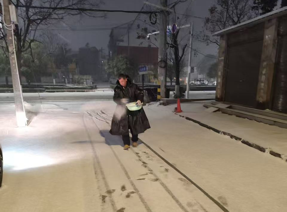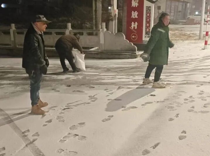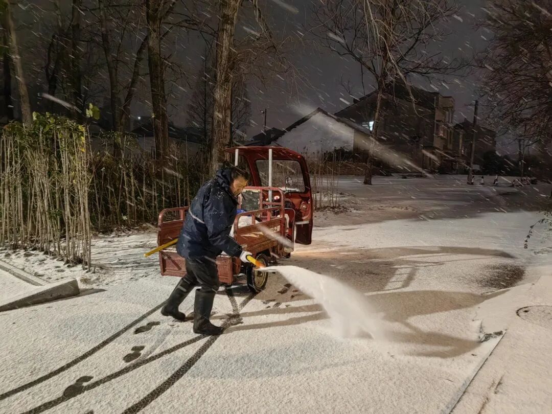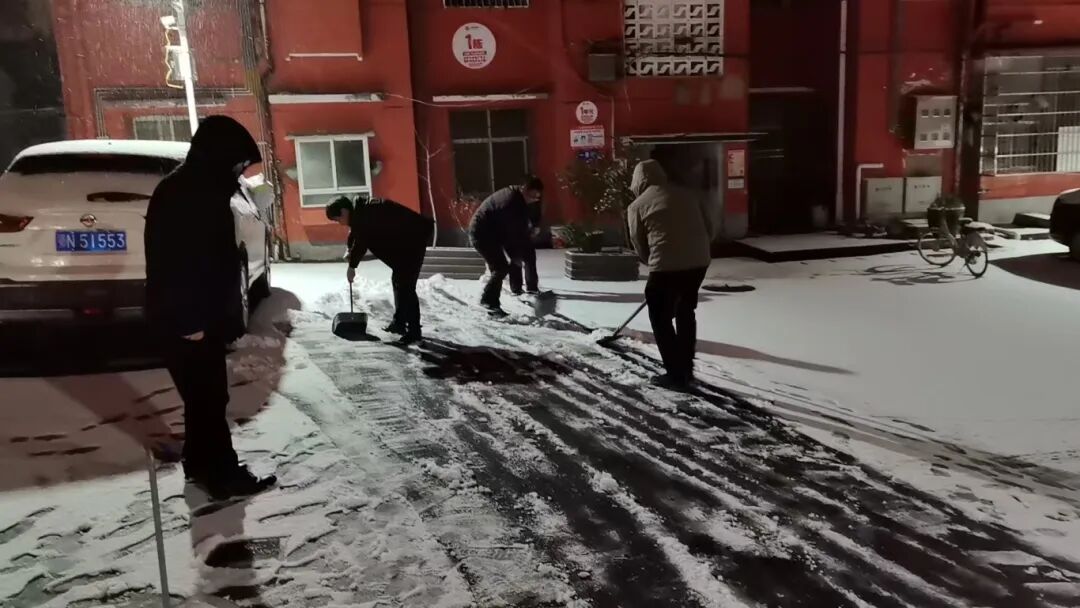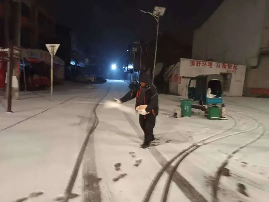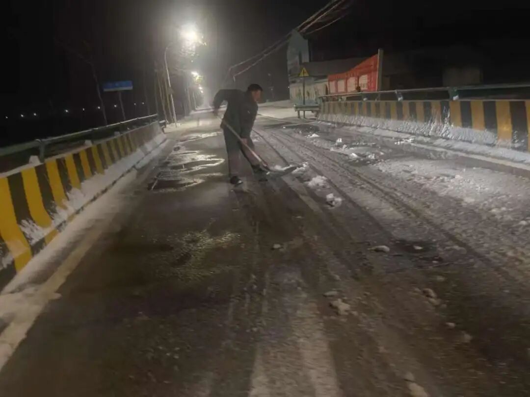 夜色中,大家顶着刺骨寒风,分工协作、默契配合:有的挥舞铁锹铲除路面薄冰,有的均匀撒布融雪盐,有的用扫帚清扫残留积雪。“这些路段是群众出行的必经之路,得早一点清理干净,可不能等雪下大了再处理!” 参与清雪的老党员说道,简单的话语里满是责任与担当。