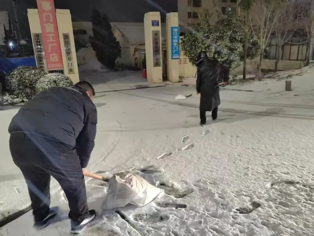 为提前应对冰雪堆积、道路结冰对群众出行的影响,19日晚,泰丰街道各村(社区)不等不靠、提前行动,迅速集结党员干部、志愿者及热心群众,配备铁锹、扫帚、融雪盐等工具,对辖区内重点路口、学校周边、陡坡急弯等关键区域开展扫雪撒盐作业。