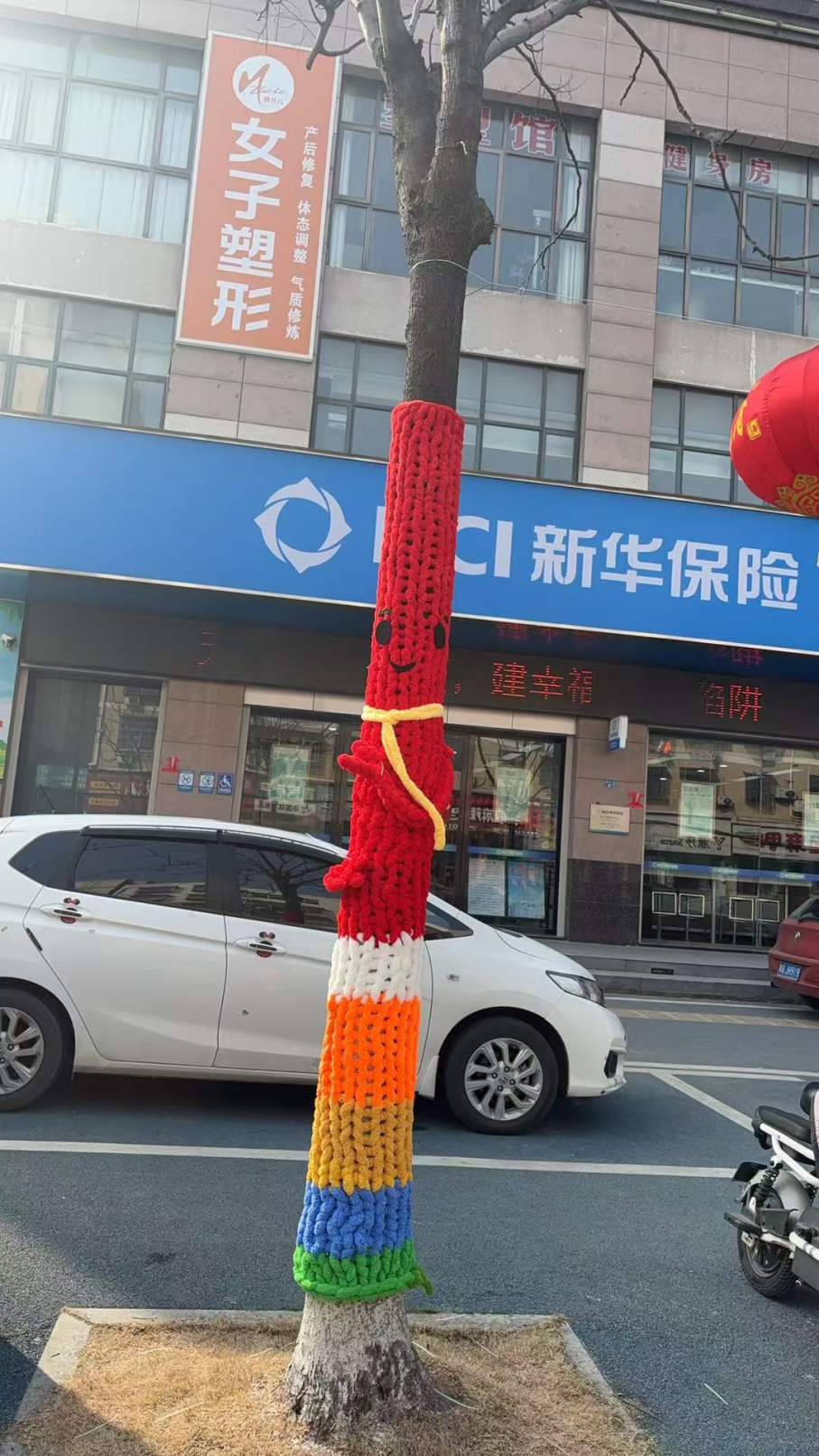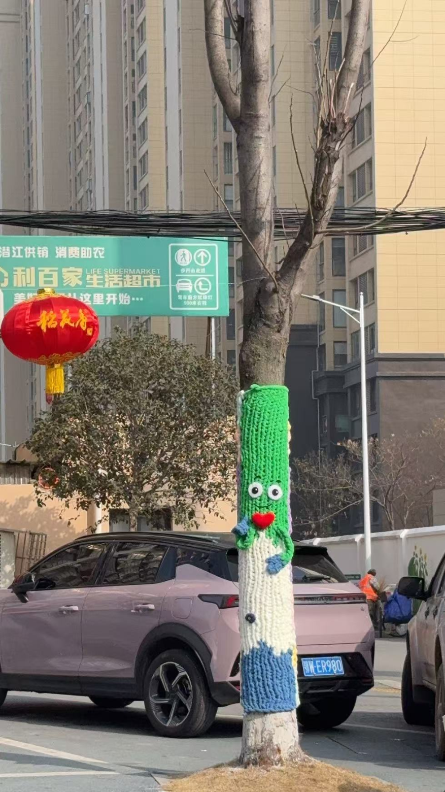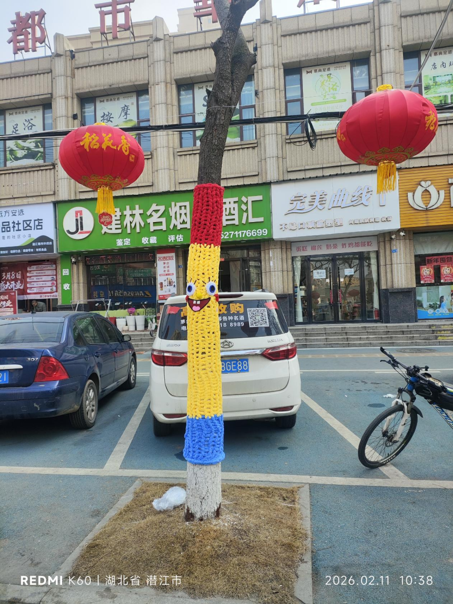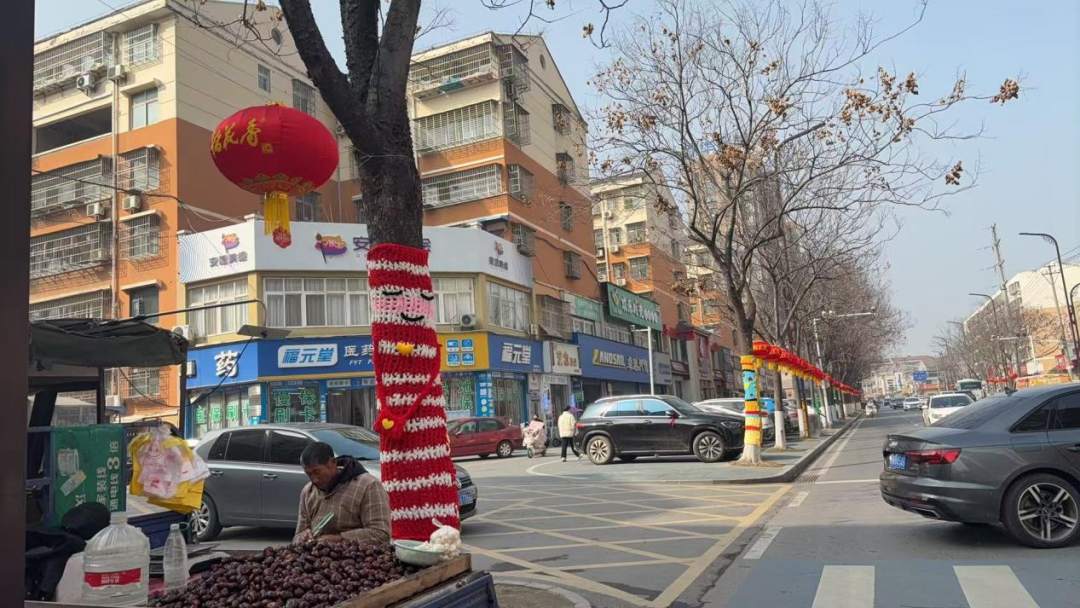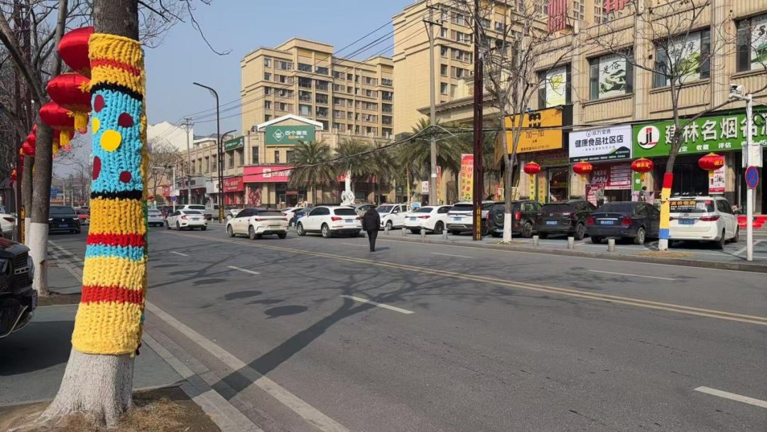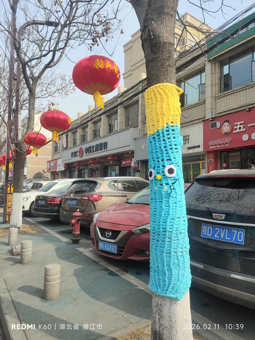 棉原社区泰丰路两侧,原本光秃秃的树干被色彩鲜艳的毛线精心包裹,十余棵树木换上别致“新衣”,化身活泼可爱的卡通形象,在道路旁上演了一场别开生面的“时装秀”。走近细看,每件树木“毛衣”都独具巧思:柔软的毛线织就出俏皮的笑脸、灵动的眼眸,有的挂着萌宠玩偶,有的点缀花朵、星星,还有的巧妙做出“手臂”造型,仿佛正向过往居民热情招手。“这些大树装扮得太有个性了,又萌又时尚,就像动画片里的场景,孩子特别喜欢。” 居民刘阿姨笑着说,如今她每天散步都会特意绕到这里,带着孙子近距离感受这份别样的自然乐趣。