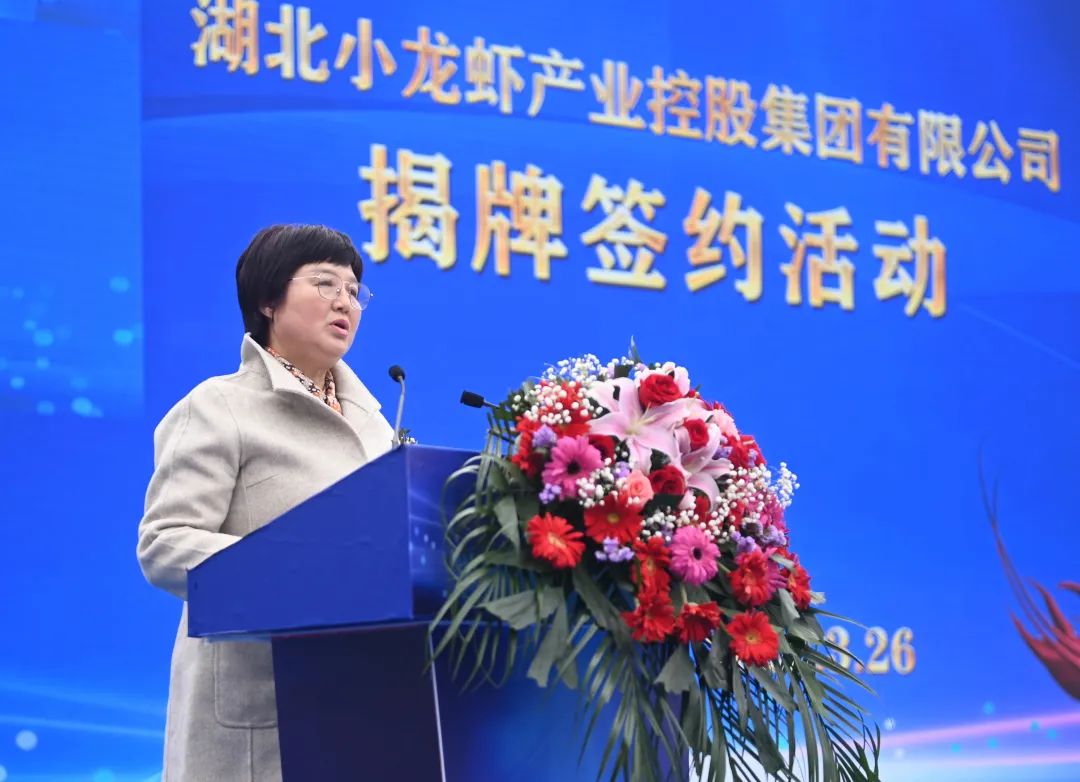 王玲对湖北小龙虾产业控股集团揭牌落户表示热烈祝贺。她说,潜江小龙虾是湖北人民的创造,是农业供给侧改革、农业转型升级的产物。20多年来,潜江小龙虾为全省粮食安全、农民增收、富民强县作出了巨大贡献。湖北小龙虾产业控股集团的成立,是省委、省政府大力发展县域经济、推动农业产业化发展的结果,是潜江市委、市政府招商引资、强链补链的又一重大成果,是湖北农业发展集团贯彻新发展理念、落实省委赋能强链工作要求的具体行动,对于我省水产事业绿色发展、促进乡村振兴、建设农业强省意义重大。