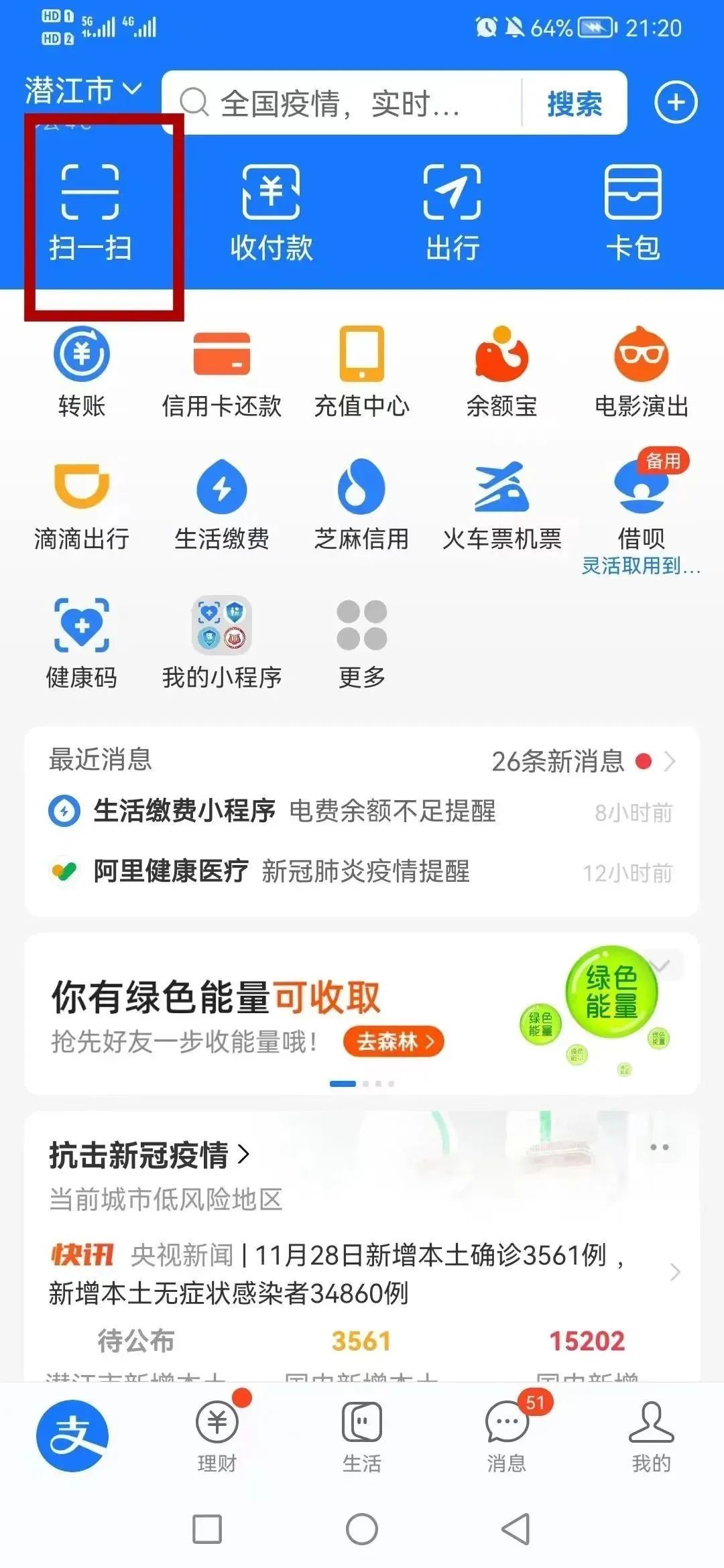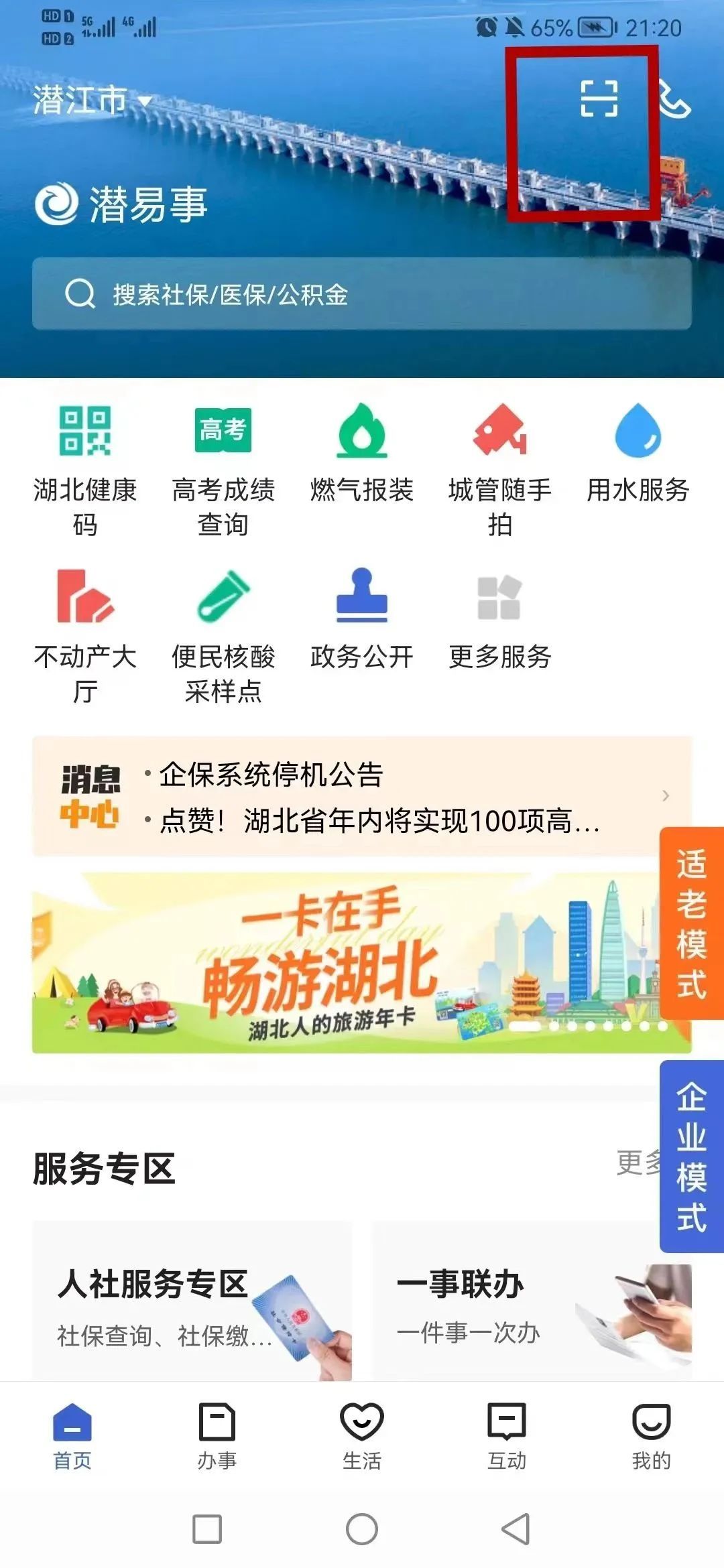 1.打开支付宝或鄂汇办软件,点击扫一扫功能