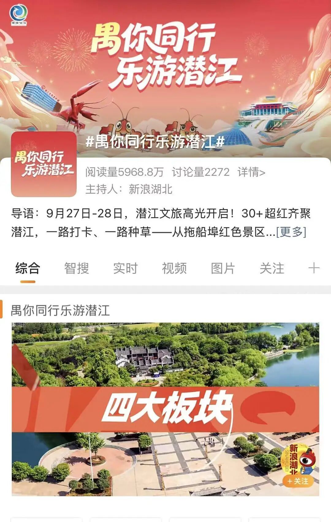 截至当日下午,#禺你同行 乐游潜江#话题阅读量突破5000万,成功荣登微博全国热搜,让潜江的多元魅力被更多人熟知与向往,也为潜江文旅发展注入了新活力。