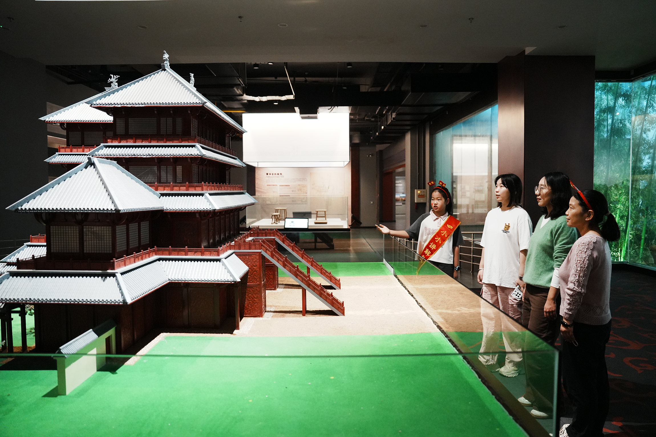 在遗址展厅内,经专业老师培训后的李依萌等孩子们化身文化使者,带领游客走进遗址展厅,用童声讲述章华台的历史故事。