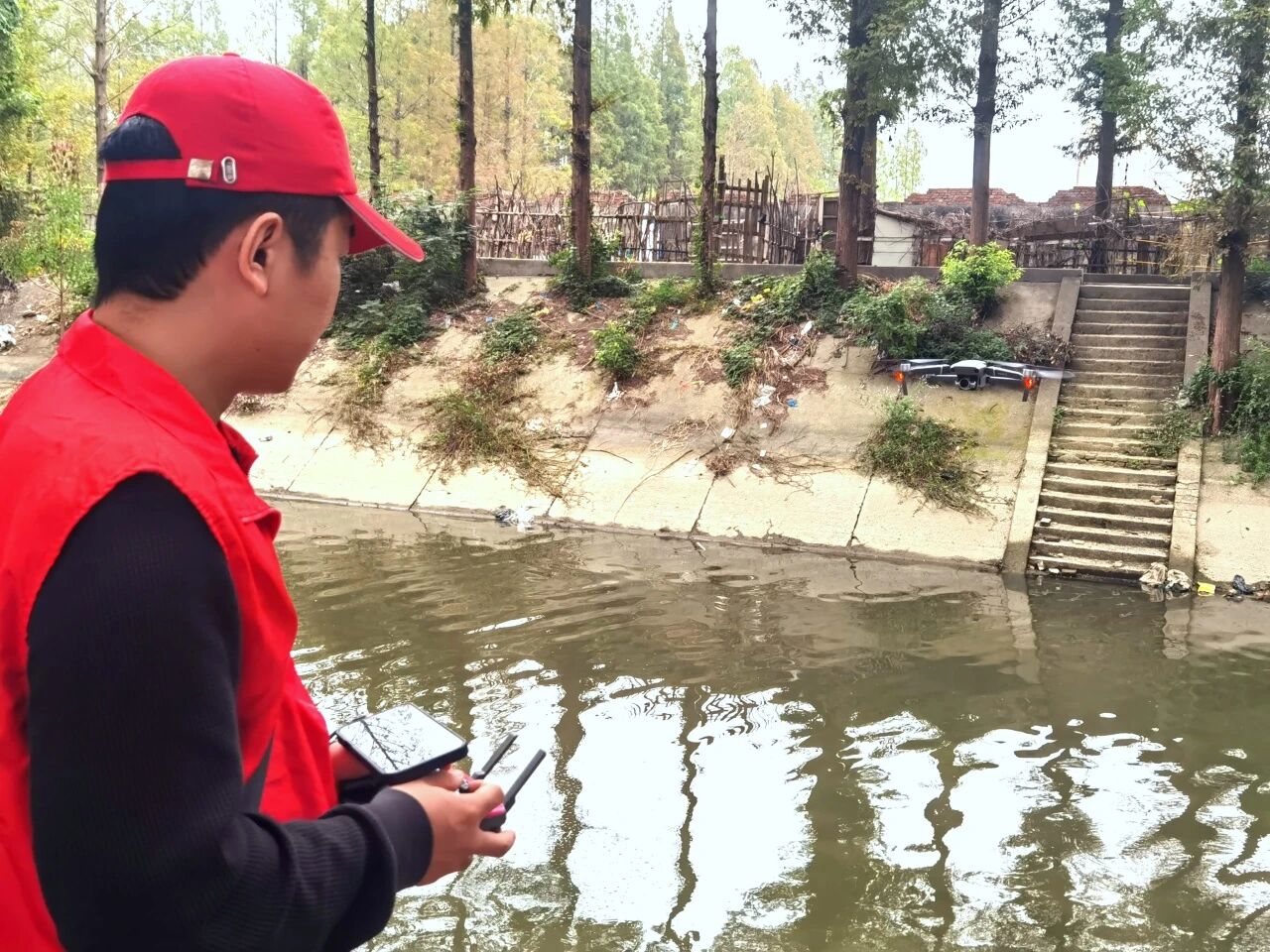 10月12日上午9时,在长白渠畔,江汉义工志愿者蒋俊操控一架无人机腾空而起,通过屏幕实时查看高空传回的高清画面,一旦发现水面漂浮物或岸坡垃圾,便立即通过对讲机通知地面志愿者团队进行精准清理。从发现问题到处置完成,形成了“空中侦察、地面处置”的高效闭环。